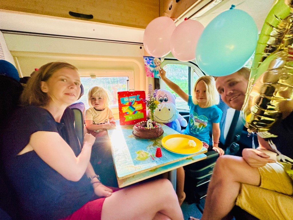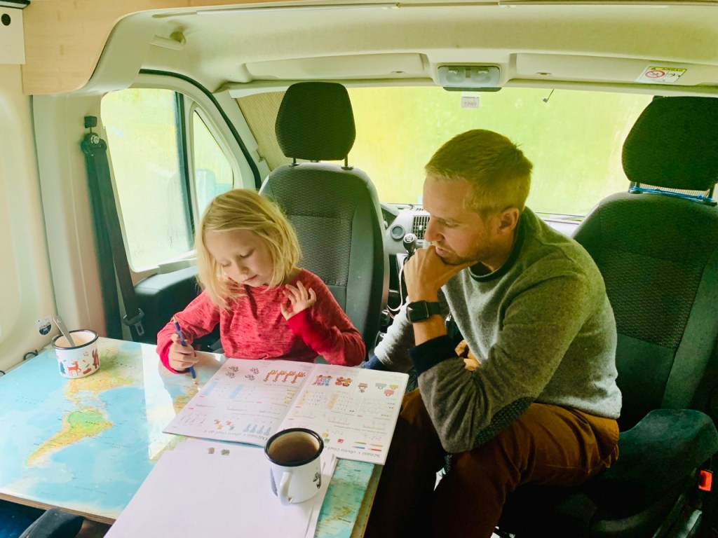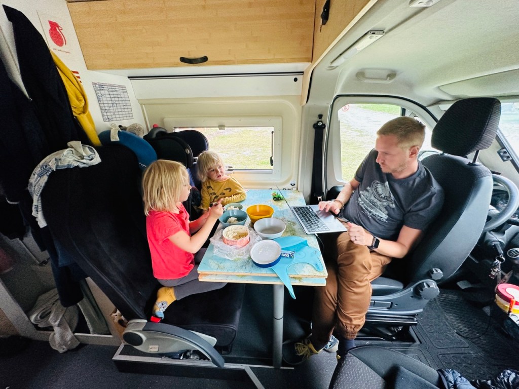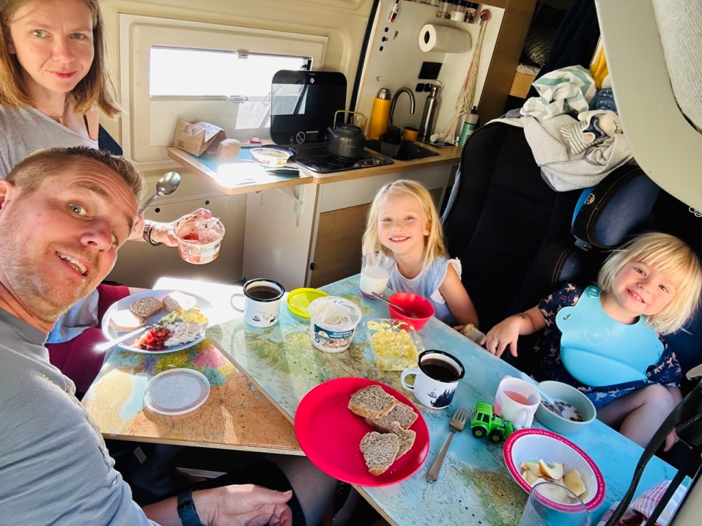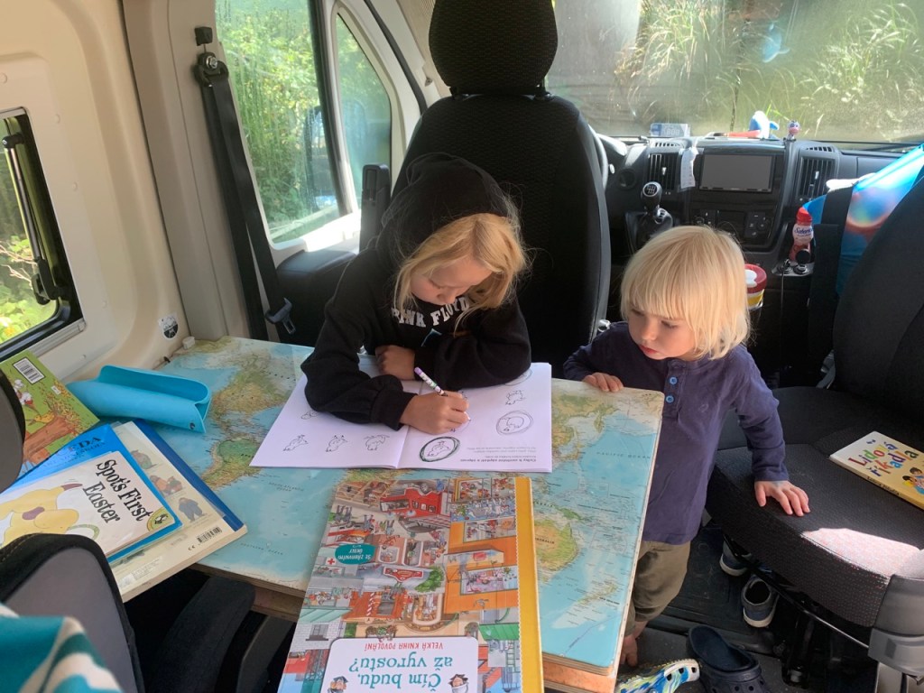 Jak název článku napovídá, už se na cestě a našem malém domově na kolech začínáme cítit jako doma. Když míříme z výletu, tak jdeme domů, když (velmi výjimečně) spíme někde jinde, těšíme se zpátky do naší postele. Kika zvládá péct chleby i koláče a zavařuje marmelády, děti si našli roztodivné způsoby jak si i z tří a půl metrů čtverečních udělat obří hernu a já zrovna tento příspěvek píšu na naší pěkné dočasné zahradě (máme tu les, vodopád i borůvky). Úložnému prostoru pod postelí říkáme sklep, tomu u zadních dveří garáž a bednám na střeše půda. Hnedle máme v autě mnohem víc místa 😃.