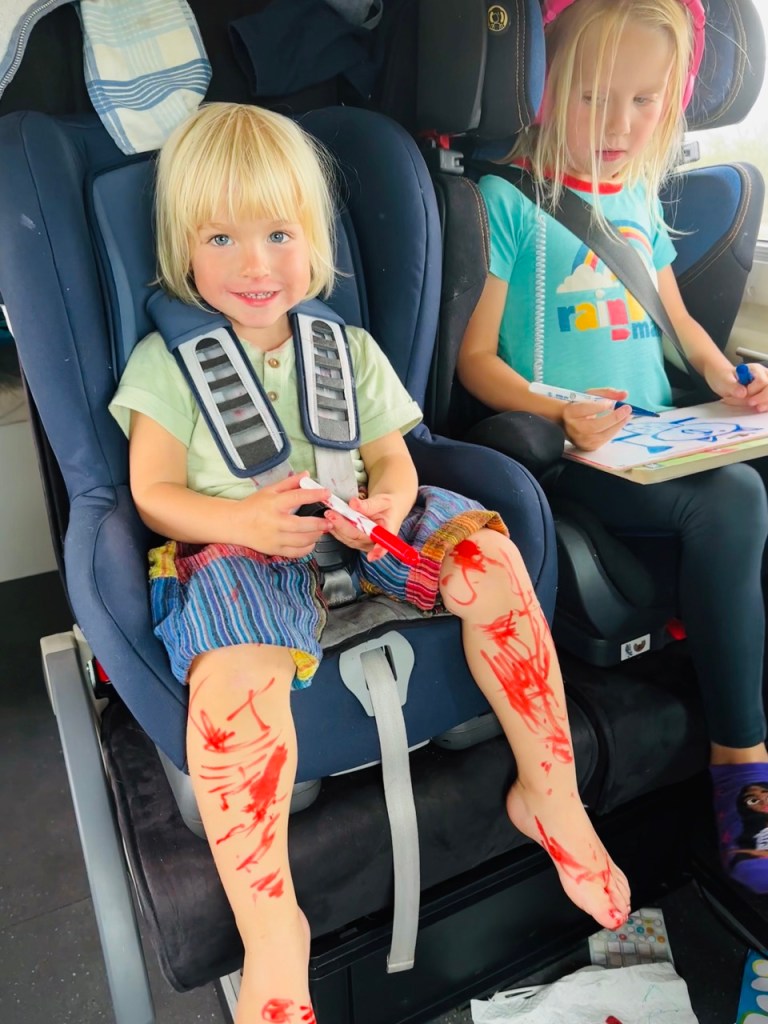 Vilém je, zdá se, v roli světoběžníka jako doma. Jakmile někde zastavíme, hrne se z auta, všechny okolo zdraví „helou“ a celkem přirozeně vnímá celý ten širý svět kterým projíždíme jako jednu velkou prolézačku. Nic moc ho netrápí a rozhodně se neptá, kdy už budeme doma 😋. Když už jsme hodně dlouho venku, začne žadonit, že chce do auta a když náhodou spíme v hotelu je z toho nesvůj a dožaduje se své postýlky v autě.