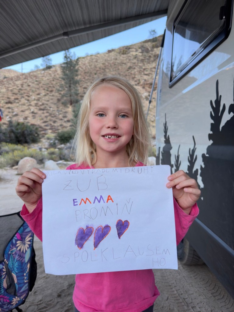 Děti si myslím životu v pohybu uvykly vskutku dobře. Emma se začíná mnohem více zajímat o to, co kolem sebe vidí, vnímá různé rozdíly na které narážíme, hodně se ptá (což nám občas leze trochu na mozek) a vnímá poměrně dobře i různé vypjaté situace (třeba když se nám porouchalo auto nebo jsme nemohli za boha najít místo na přespání). Baví jí být v těchto situacích „rozumná“ a snaží se pomoct najít řešení (někdy jde skutečně o neotřelé nápady).