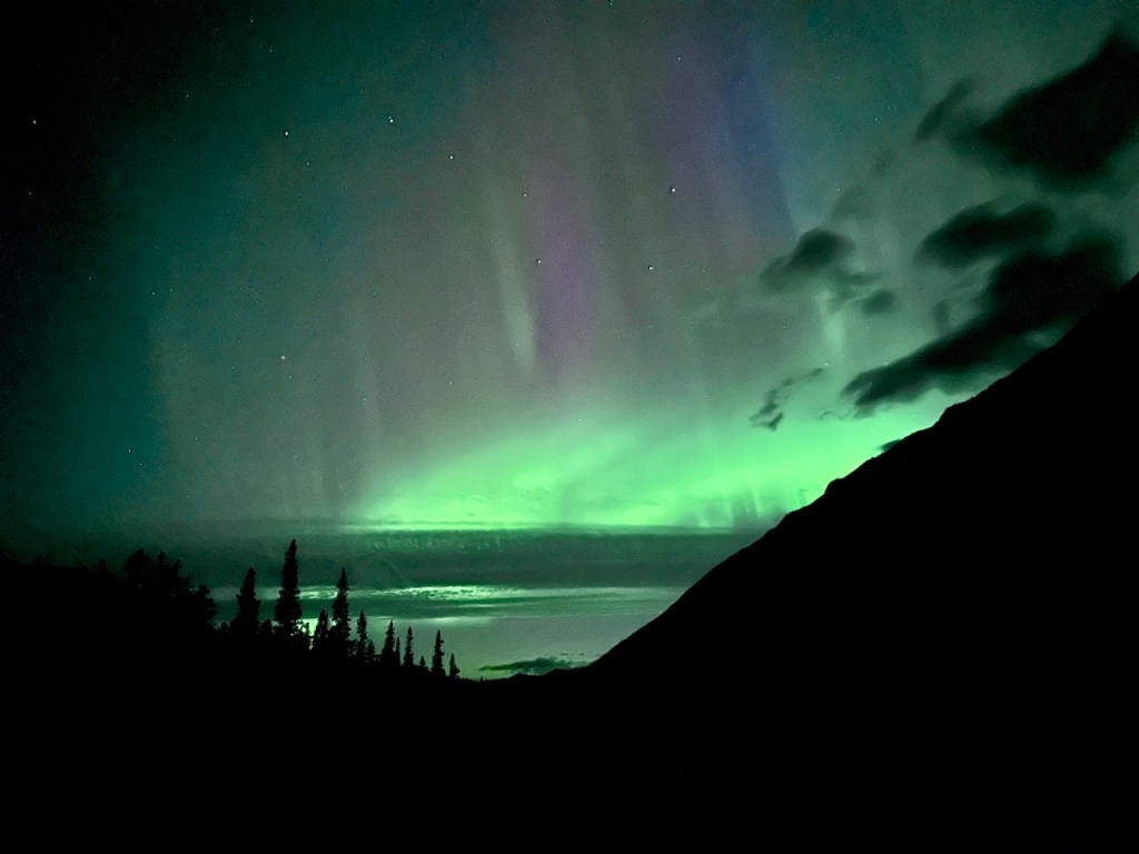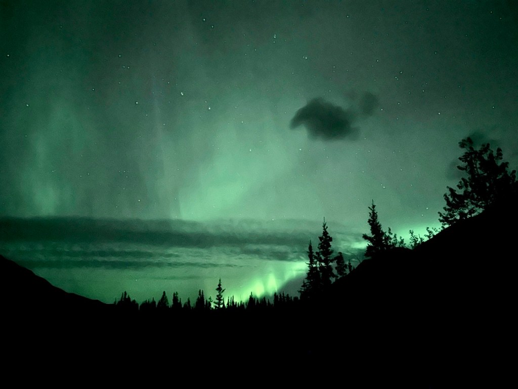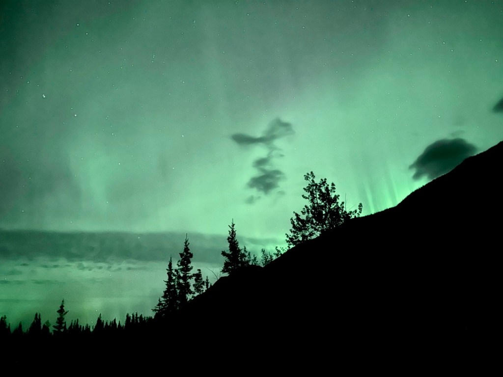 I proto zase jednou volíme noční přejezd. Na silnicích krom občasného jelena nebo sovy nepotkáváme skoro nikoho. Když už jsme skoro na místě, na kterém plánujeme tu noc přespat (okolo jedné hodiny ranní), začínám mít zvláštní dojem, že jsme snad z aljašské dálnice sjeli na mléčnou dráhu. Noční obloha se najednou všude kolem povážlivě vlní (asi jako když koukáte na mořské vlny od dna) a je na středoevropské standardy až příliš fluorescentní. Raději stavím u krajnice, vypínám motor a pak i světla. Kika se začne zuřivě hryzat do ruky neb si myslí, že usnula za volantem a chce zabránit tragédii. Ale neusnula, to nás sever vítá polární září…