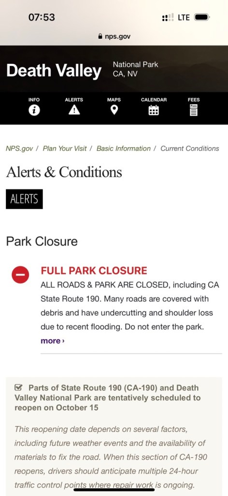 Nejdříve máme namířeno do národního parku Death Valley (Údolí Smrti), kde se krom písku a kamení nachází také nejníže položené místo v USA. Google mapy nám nicméně sveřepě odmítají najít cestu. Následně zjišťujeme, že tento na výsost pouštní park, typický velmi vysokými teplotami a extrémním suchem je už měsíc zavřený, protože zde odklízejí následky srpnových bleskových povodní. Nezbývá nám tedy nic jiného, než vyrazit o poušť dál.