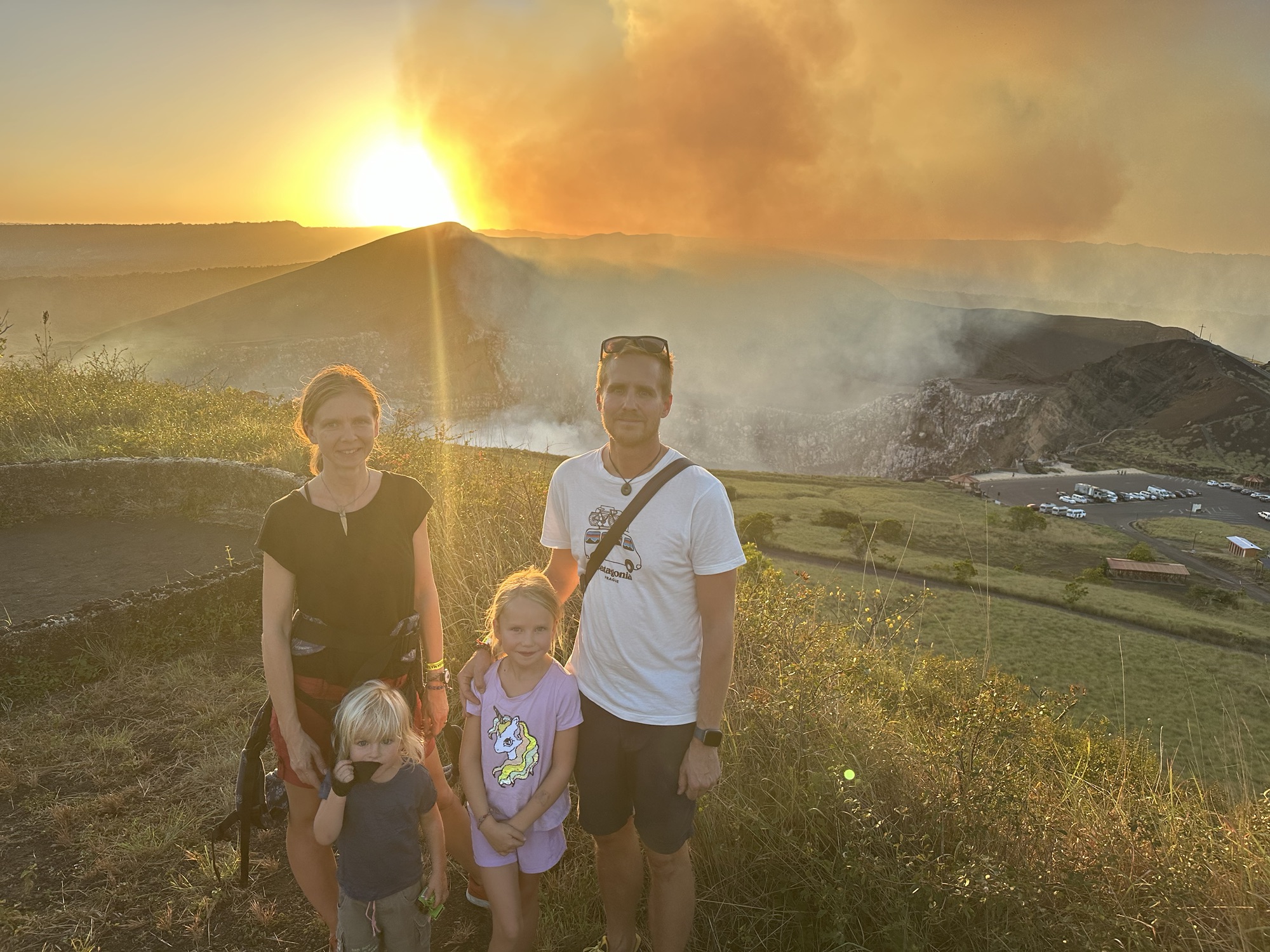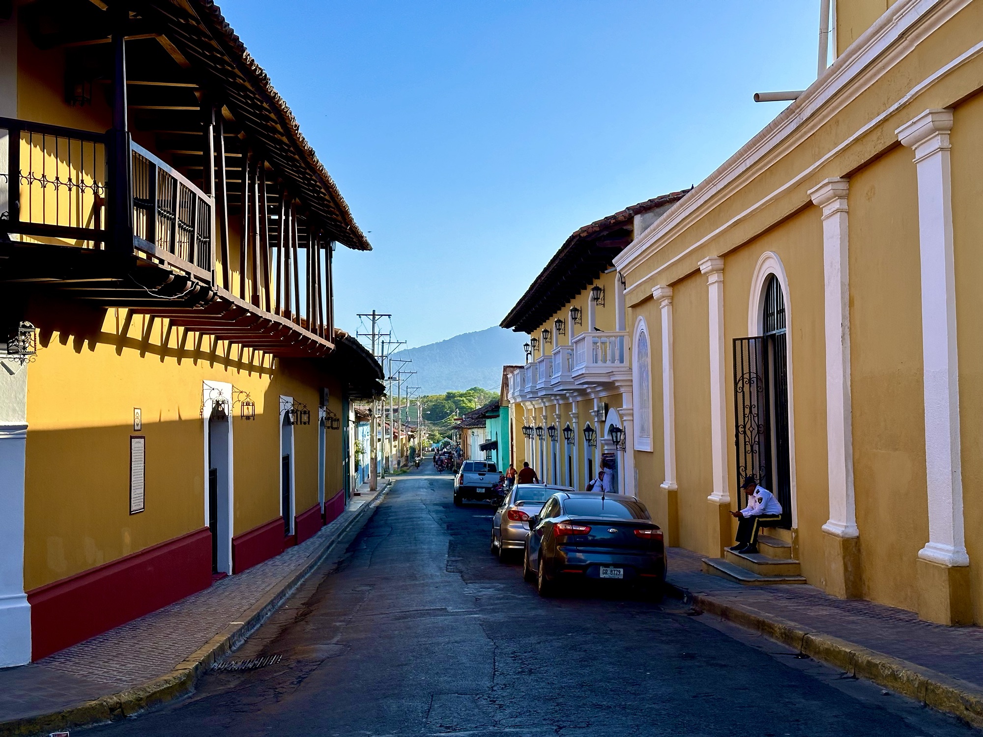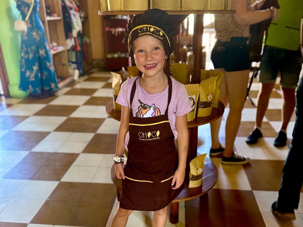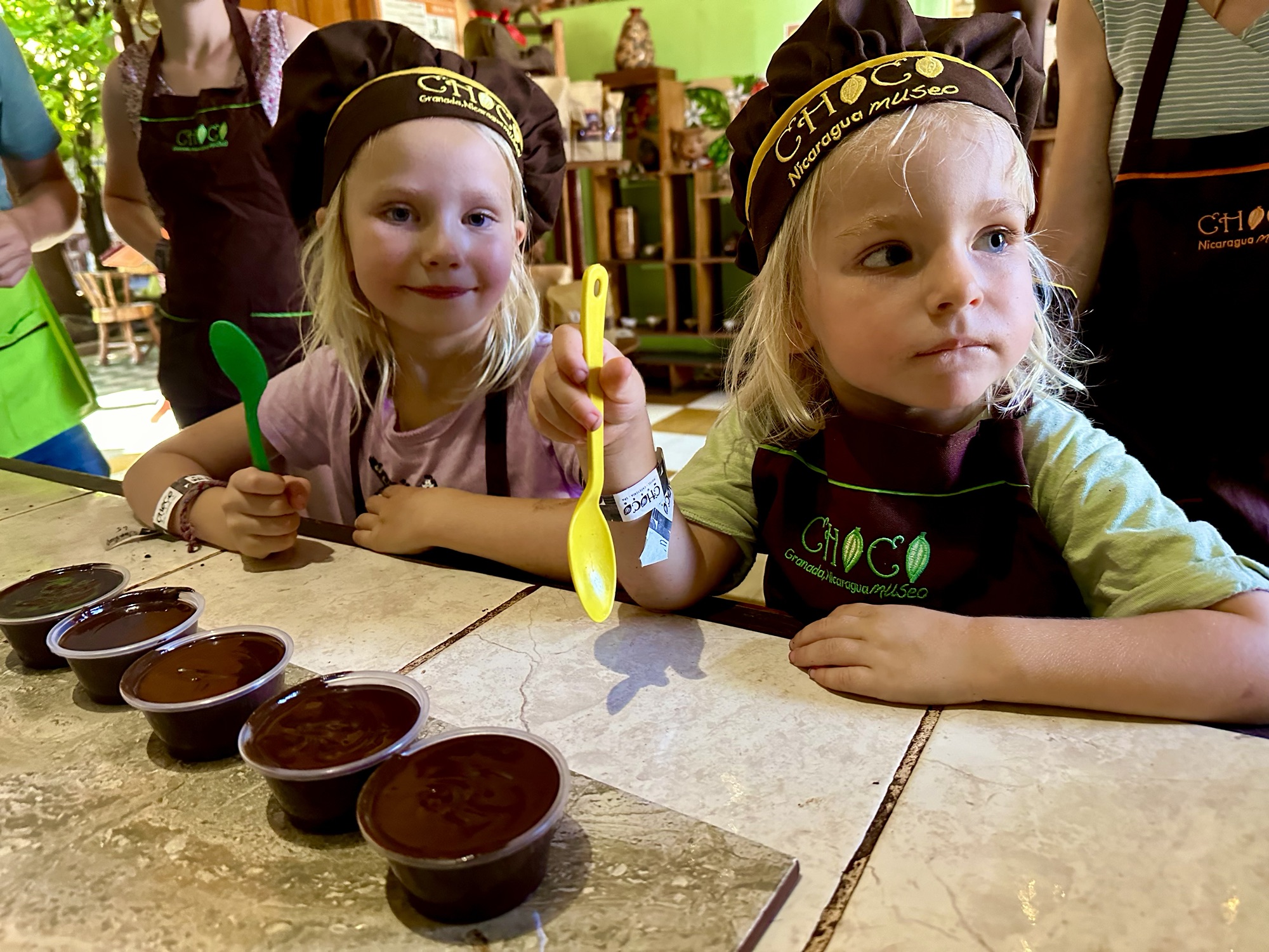 Pro projíždějícího cestovatele je to však destinace přívětivá a to nejen díky překvapivě dobrému stavu místních silnic. Je tu levně, příjemně tropicky, jídlo ucházející (člověka překvapí jak je kuchyně celé střední Ameriky, například v porovnání s Mexikem, nudná – rýže, fazole, juka a kuře, občas kolečko okurky) a lidé přívětiví. Krom revolučního Leonu navštěvujeme také koloniální Granadu, kde jsme se s Kiki už před mnoha lety také mihli a shledáme, že se tu nic moc nového za tu dobu neudálo. Zajdeme také na workshop výroby čokolády, který si Emma dlouho přála. Blažený výraz na její i Vilíkově čokoládou umazané tváři svědčí o tom, že to stálo za to. Cestou do Granady se také zastavujeme u sopky Masaya, kterážto umožňuje v podstatě přímo z parkoviště nahlédnout do svého rozžhaveného chřtánu. Výšlap na přilehlý vyhaslý sopouch na parádní západ slunce a následné čučení do bublající lávové polévky nás baví všechny. Vilík by si rád opekl maršmelouny, Emma vymýšlí jak na to. Nemá však bohužel dost špejlí, které by mohla pospojovat v jeden obří opékací klacík.
