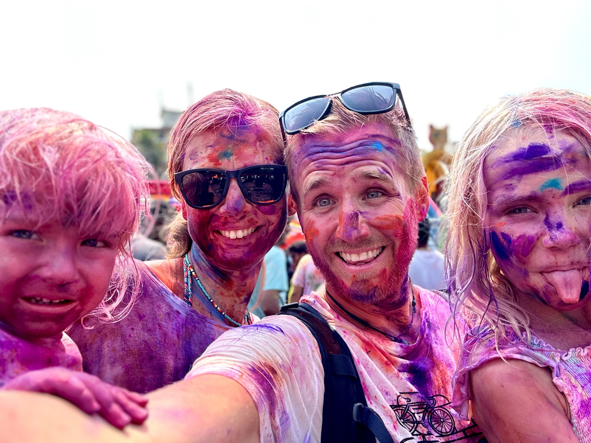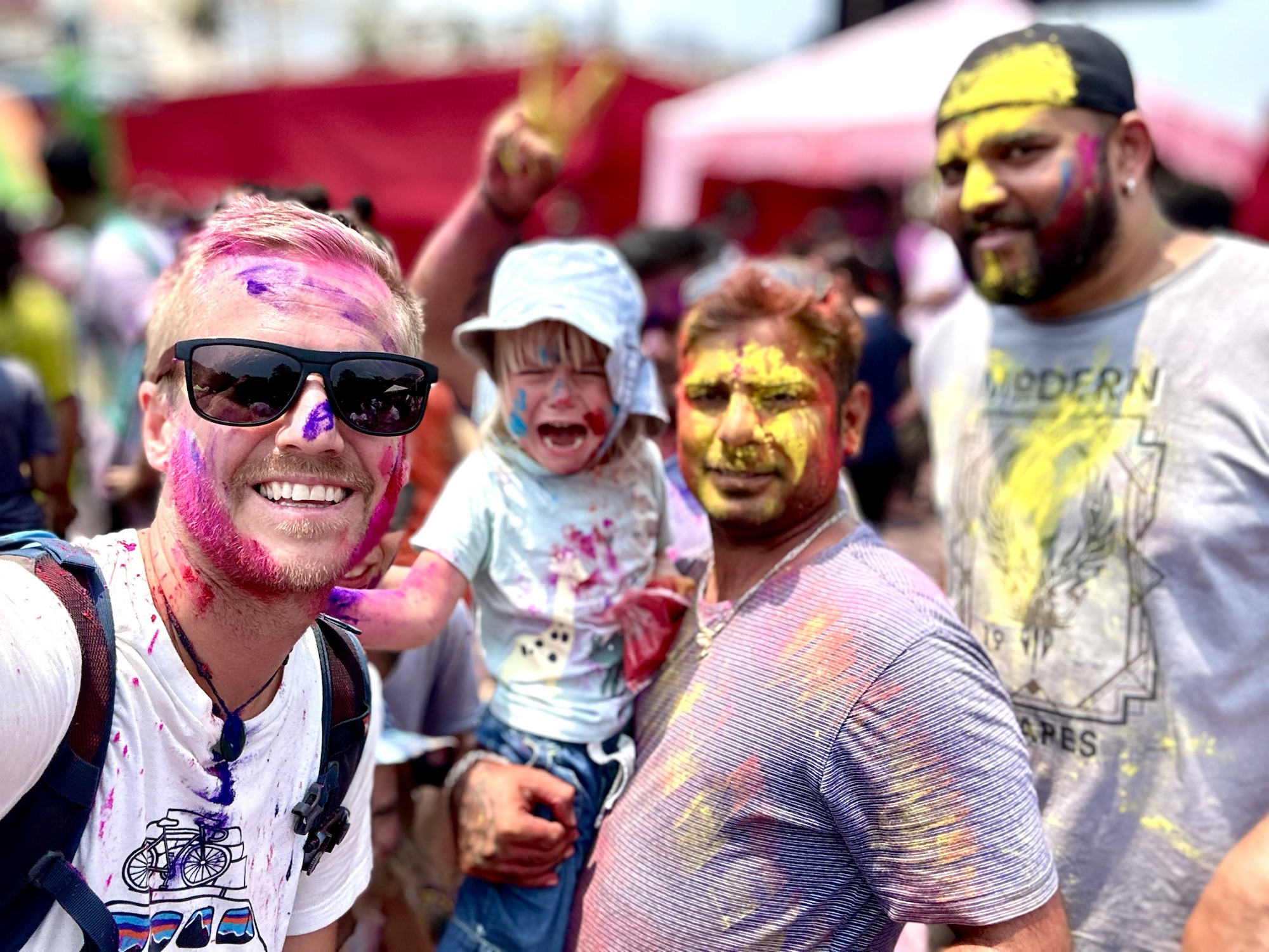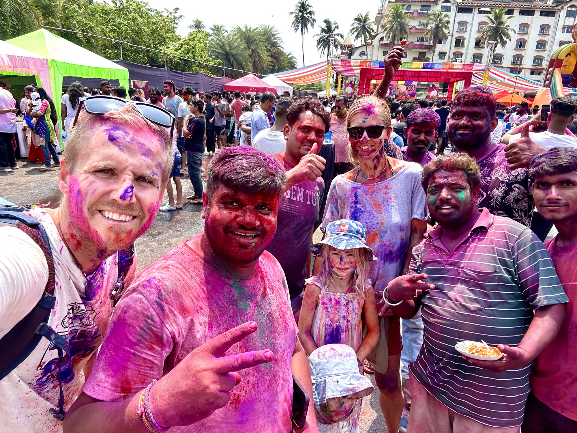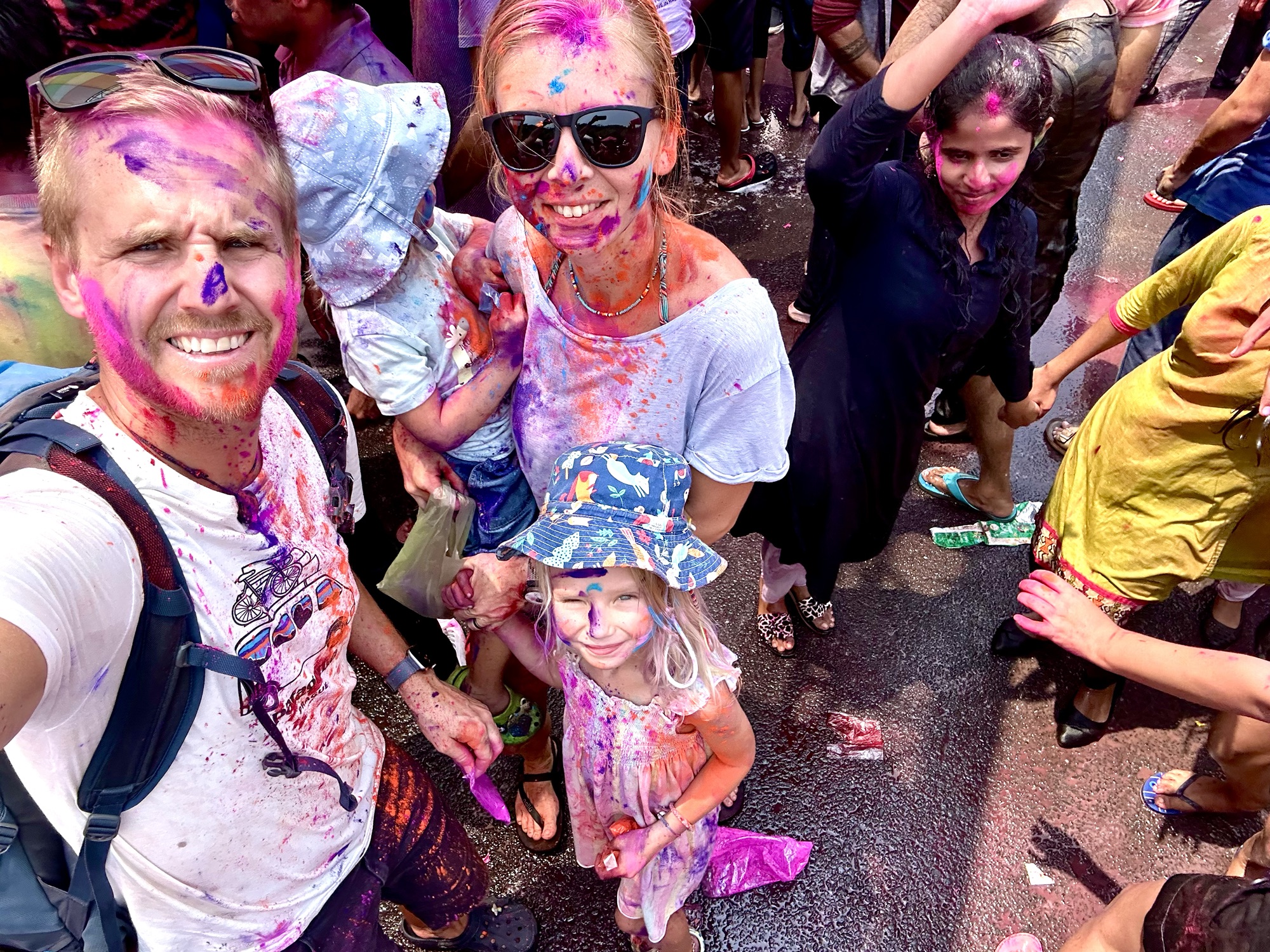 Necháme se také zlákat nabídkou našeho pana domácího a s jeho asistencí vyrážíme oslavit jeden z největších indických svátků – svátek barev Holi (oslavující příchod jara, takové naše Čarodějnice). A je to hodně bláznivá podívaná. V uzavřeném komplexu je namačkáno asi tisíc lidí, kteří posilněni alkoholem neúnavně tancují na zběsilou indickou disko hudbu, hází a mažou po sobě barevnými prášky, kterých mají plné kapsy a nechávají se smáčet z vodního děla s bublinkami. Jako u většiny jiných podobných zábav je zde více mužů než žen. Pro našince je to pořád zvláštní podívaná, vidět skupinky mladých Indů, jak spolu tančí, objímají se a cákají po sobě vodou a bublinama. Jelikož jde o čistě indickou kratochvíli, naše blonďaté hlavičky rychle vzbudí mnoho pozornosti. Náš pan domácí má samozřejmě potřebu se o nás patřičně postarat, takže nás pořád postrkuje, ať jdeme tančit, ať se jdeme napít a vůbec ať jsme nejvíc nejveselejší. Je také náležitě hrdý, že má s sebou takovou významnou atrakci, tedy chci říct návštěvu. Jako vždy se s námi chtějí všichni fotit, náš průvodce je ale odhání, respektive ne každému to dovolí. Máme podezření, že za to bokem vybírá nějaký poplatek. Možná ve formě piva, které pije rychlostí, za kterou by se nemusel stydět ani kdejaký Pepík z Horní Dolní. A jelikož je Holi jeden z mála svátků, kdy mají Indové pití alkoholu povoleno, netrvá to dlouho a náš hostitel (k naší radosti) již nezvládá plnit své průvodcovské povinnosti a ztrácí se někde mezi skákacím hradem a pupkem vesmíru. Když se po dvou hodinách znovu probere, zrovna v okamžiku, kdy se chystáme odejít, trvá na tom, že nás těch 15 kilometrů zpět domů musí odvézt. Námitky, že se všichni na jeho motorku nevejdeme nepřijímá, stejně jako fakt, že je stále zlitej jak slíva. Zdvořile proto raději bereme nohy na ramena a než se jeho zastřené oči rozkoukají, skáčeme do tuk tuku a zamazaní od barev od hlavy až k patě ujíždíme pryč.