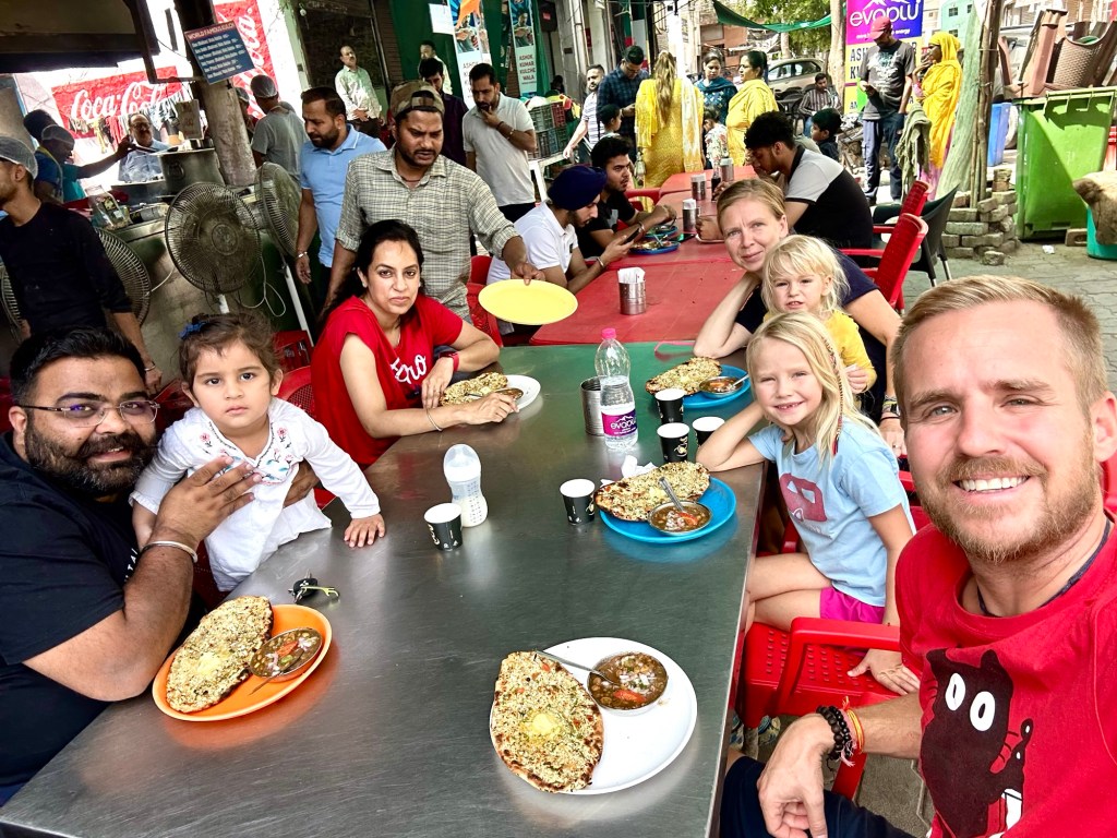 Pak už nás opět čeká sjezd do údolí, do Paňdžábu, do hlavního města Amritsaru a bohužel opět do 35 stupňů celsia. „Ubytováváme se“ před domem Amrita, nadšeného cestovatele a „overlandera“, jak si my, co brázdíme svět výhradně po zemi, říkáme. Spojili jsme se s ním předem přes naší oblíbenou iOverlander aplikaci a máme radost, že můžeme nahlédnou do života takové normální indické (středostavovské) rodinky. Děti mají radost násobnou, protože přímo před Amritovým domem (a teď i před tím naším) je překvapivě pěkné hřiště a spousta dětí, které si chtějí hrát. Amrit je asi první Ind, který si postavil svůj vlastní obytný vůz – krásné expediční vozítko postavené ze staré armádní sanitky. Máme si proto o čem povídat a jelikož Amrit zná ve městě kde koho, necháme si u jeho dvorního mechanika vyměnit olej a všechny možné filtry (abychom se řádně připravili na nadcházející přejezd Himalájů) a u rodinného svářeče zase svařit zlomenou kliku k markýze. Jak zjistím, Armit je také vášnivým amatérským hráčem badmintonu a já se tak znenadání ocitnu jeden večer na kurtu a následně v hospodě u piva. V hale je sice asi padesát stupňů a mé sportu již odvyklé tělo a čtyřem pivům odvyklá hlava mě pak bolí asi týden, ale bylo to skutečně mentálně osvěžující.