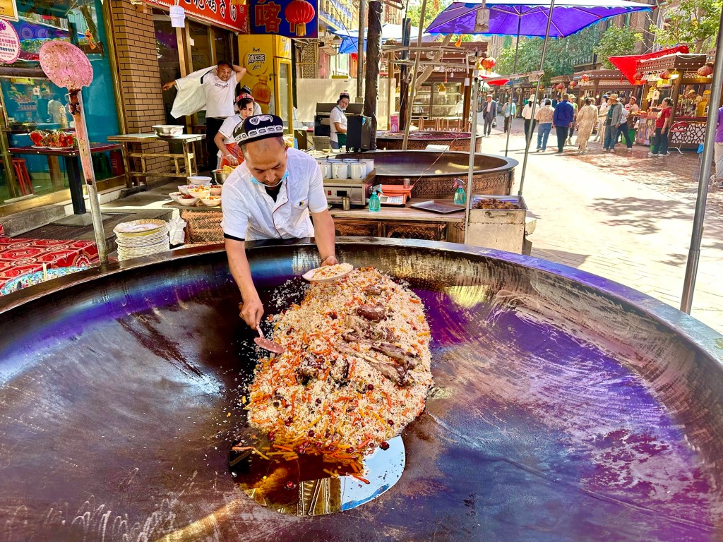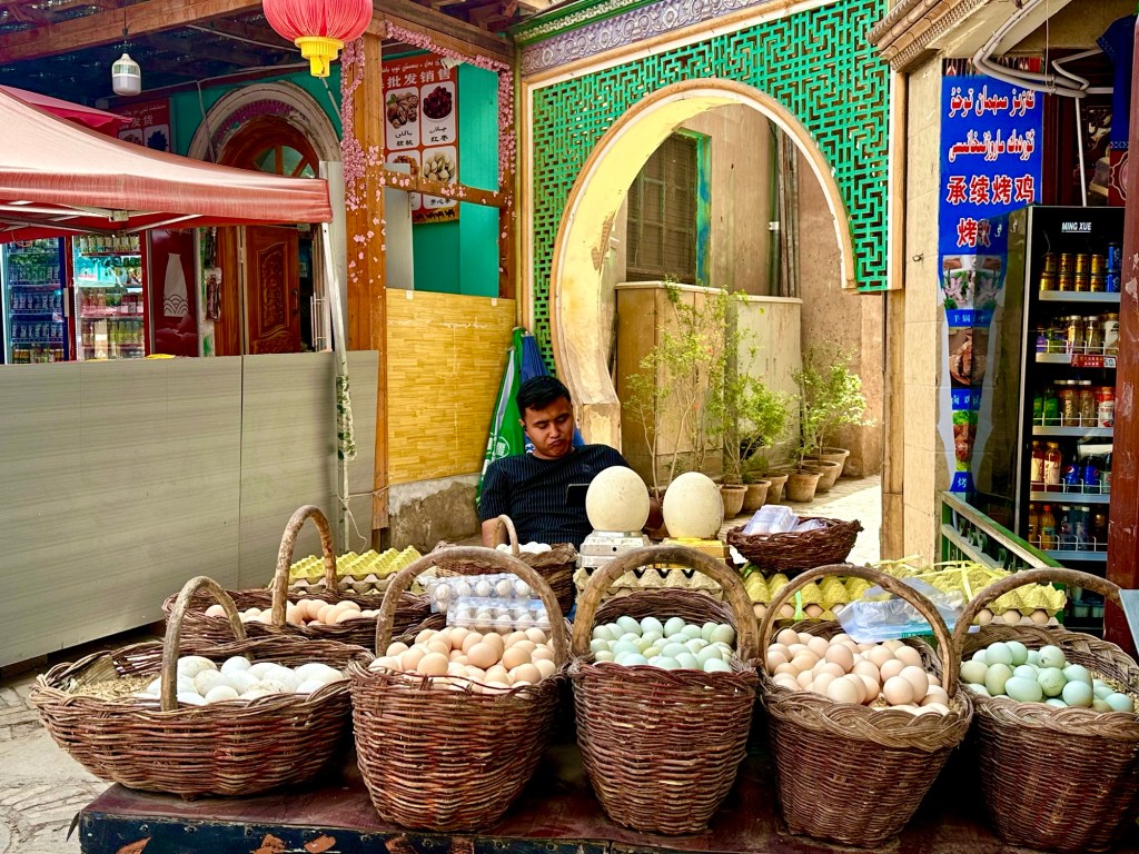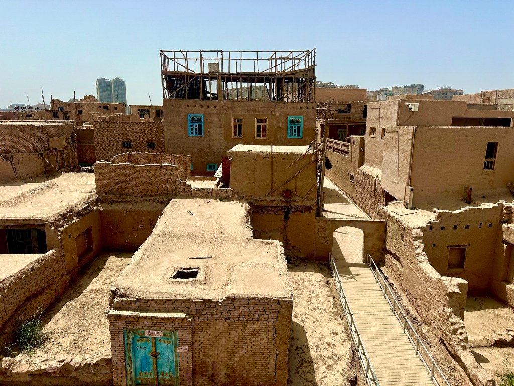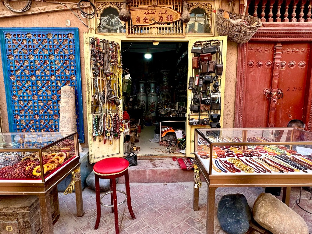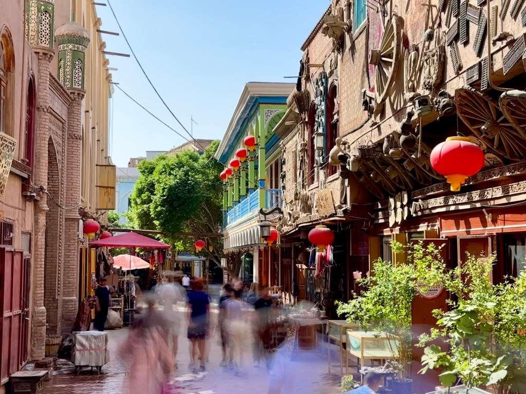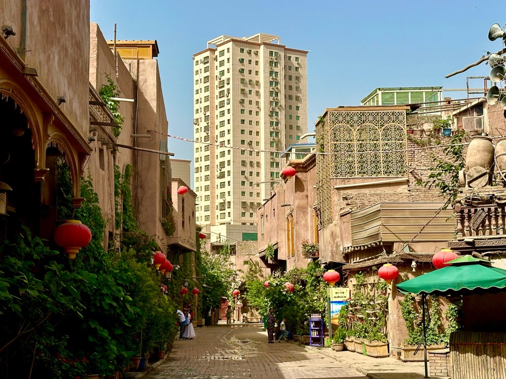 Kašgar se změnil tak, že jej vlastně vůbec nepoznáváme. Celé staré historické centrum bylo strženo a znovu postaveno jako turistická pěší zóna, kde se střídá jeden obchod se suvenýry s druhým. Celé to působí jak šíleně kýčovitá kulisa. Původní stará mešita už také slouží jen jako turistická atrakce. Ulice jsou plné turistů – etnických Číňanů, kteří si natáčejí zkrocené Ujgury v krojích tancujících před restauracemi a hrající na lidové hudební instrumenty, nakupují suvenýry a obdivují se té nádheře. Tomu všemu kyne z náměstí všelidové revoluce obří socha Maa, veškeré nápisy jsou jen v čínštině, čas se řídí pekingským časovým pásmem (slunce tu proto vychází okolo deváté ranní) a zdá se, že krom bagelů toho zde z autentické ujgurské kultury nezbylo skoro nic. Je to hodně smutná podívaná. Zvrácený Disneyland pro turisty.