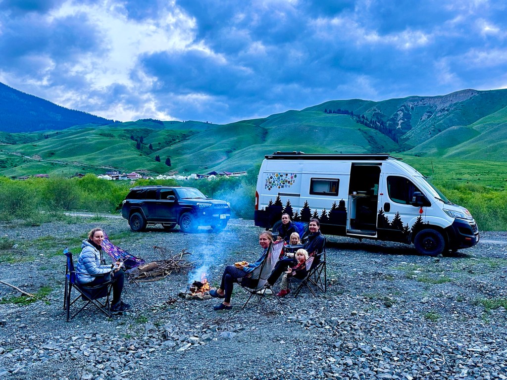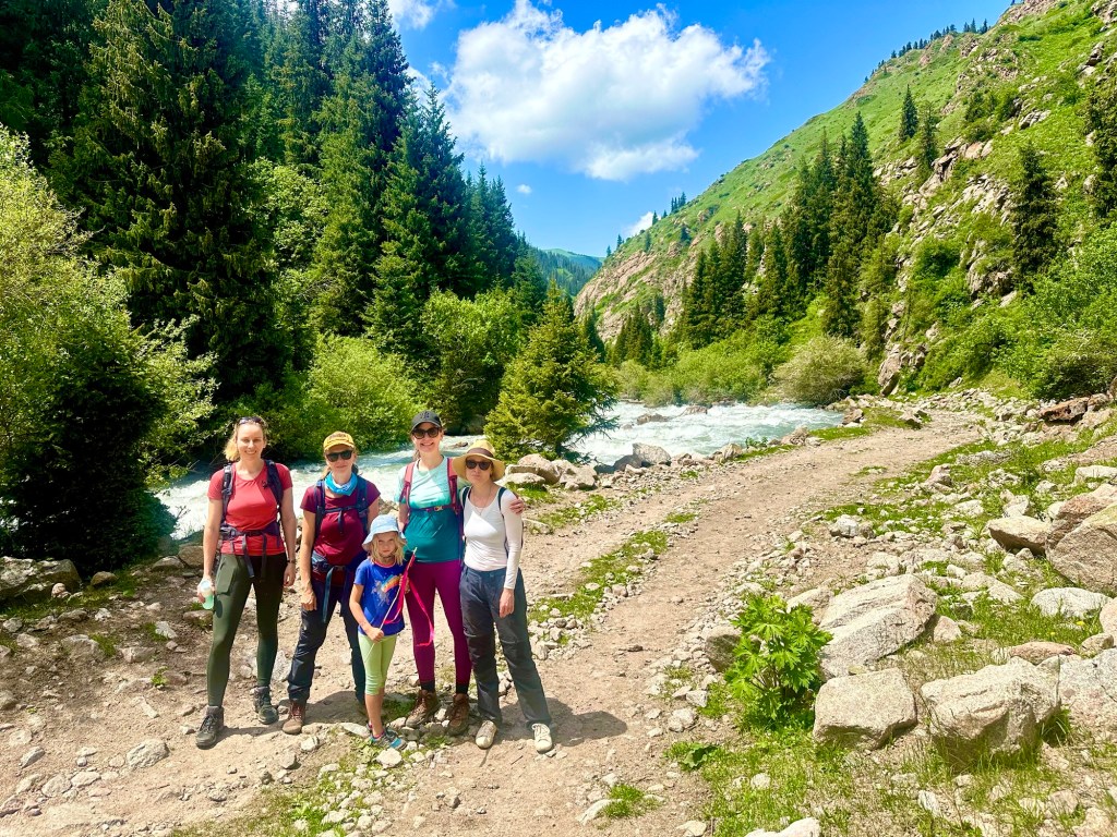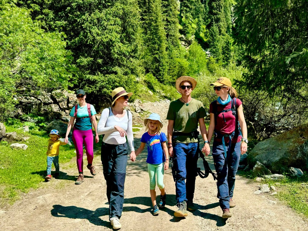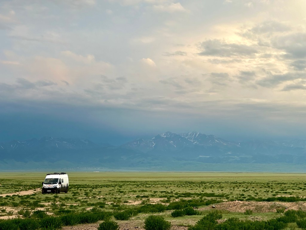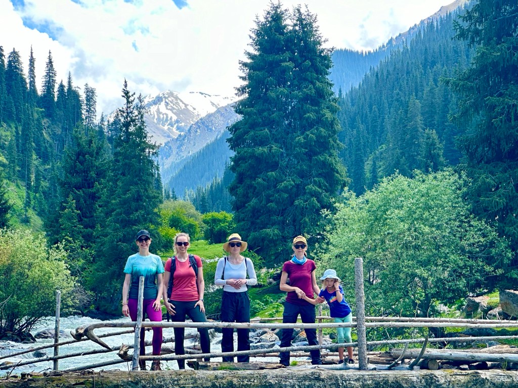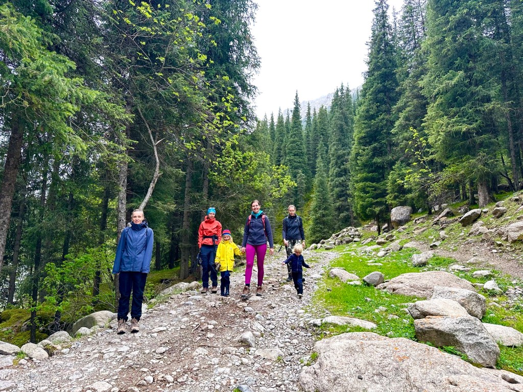 Ráno si přivstaneme. Emmu už totiž od večera „lochtá v bříšku“ neb se už nemůže dočkat dne (a my samozřejmě s ní). O pár set kilometrů dál na nás totiž čeká návštěva z Mělníka a Bruselu. Zase za námi dorazila Patra s Blankou, tentokrát doplněny i o mou sestřenici Silvu. Naši věrní čtenáři disponující funkční pamětí si jistě vybaví, že jednou už jsme se už na téhle cestě s Petrou a Blankou potkali – bylo to před neuvěřitelnými devíti měsíci v Kanadě. Je to už osvědčená receptura a my se zase těšíme na milou společnost. Děti se už tetiček také nemůžou dočkat, a proto spěcháme k jezeru Issyk-Kul, u kterého máme spicha. Holky na nás čekají v útulných jurtičkách na břehu jezera a naše shledání tak nemůže být stylovější. Jezero Issyk-kul leží v podhůří pohoří Tian Šan. Tian Šan, tedy Nebeské hory, je jedno z největších pohoří světa, doplňující onu svatou velehorskou trojici Himalájí, Karakoramu a Pamíru. Tvoří také přirozenou hranici mezi oběma zeměmi a Čínou, což se asi docela hodí.