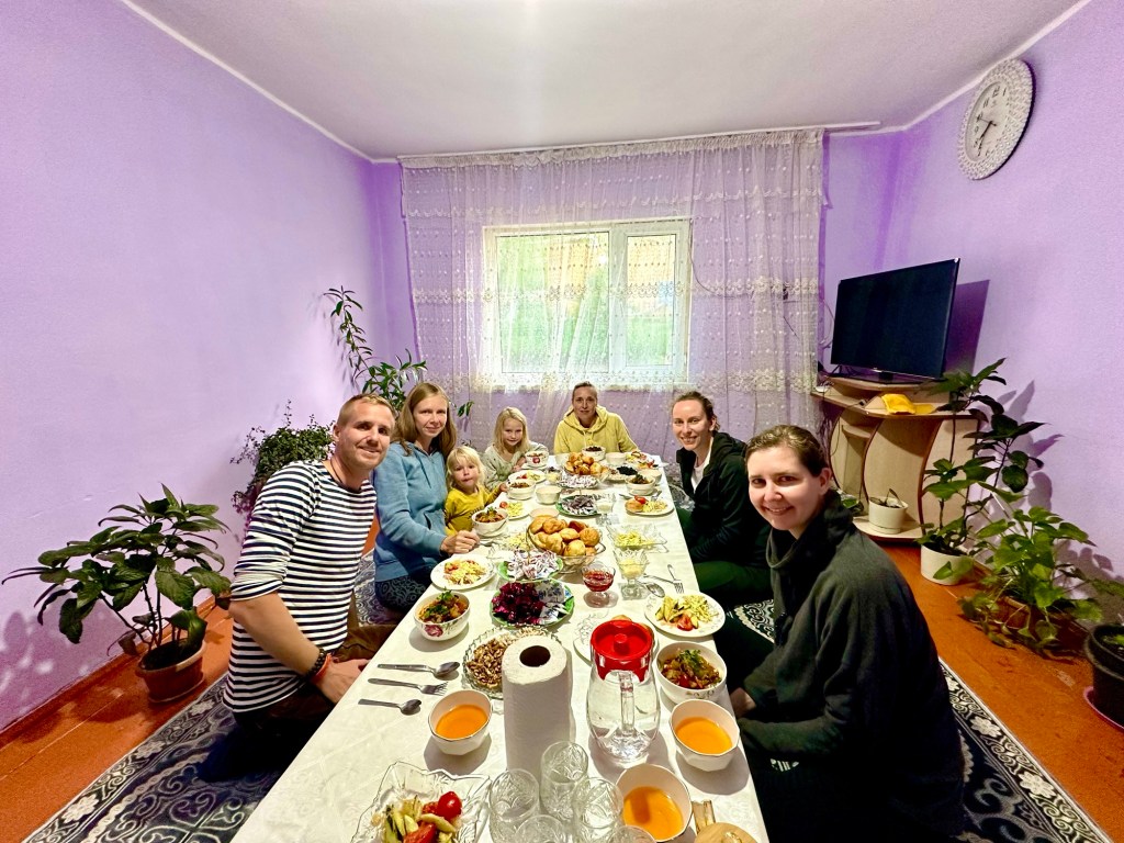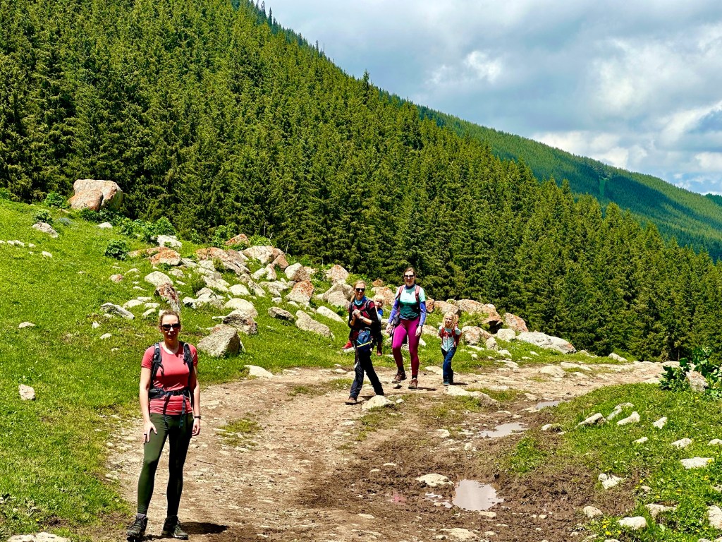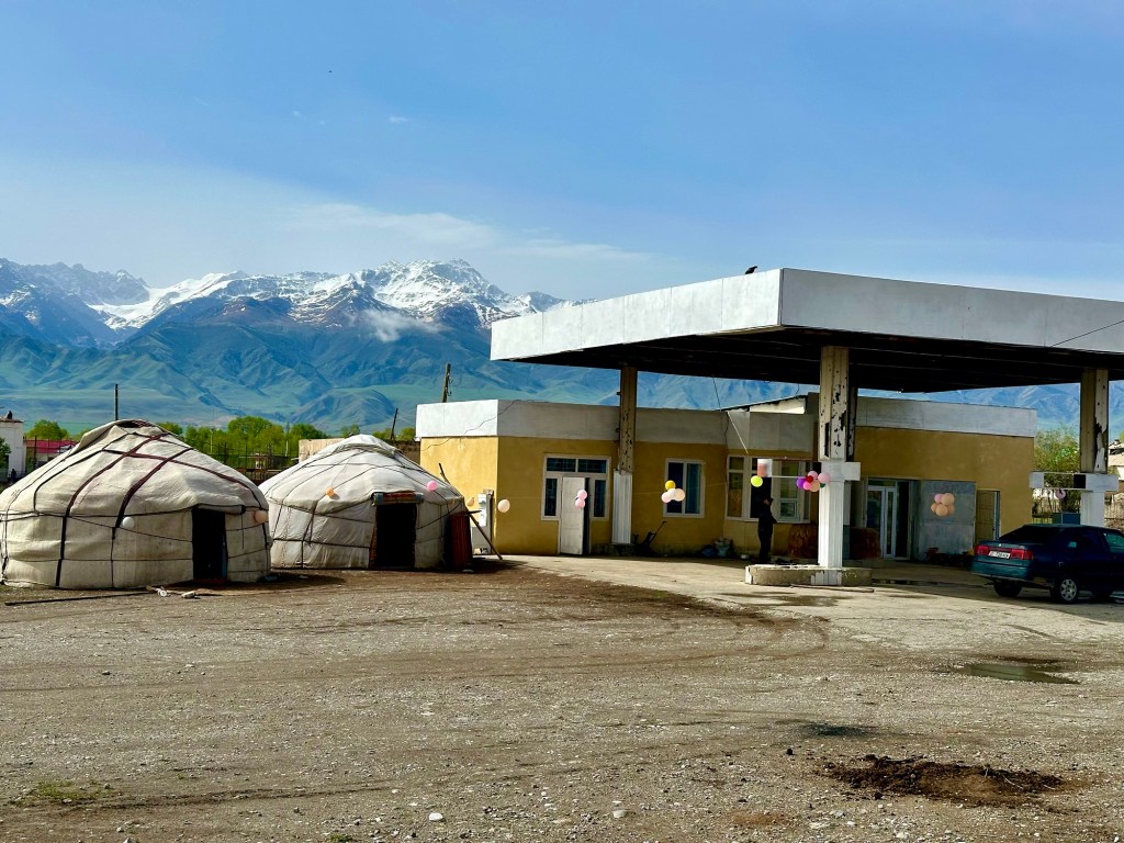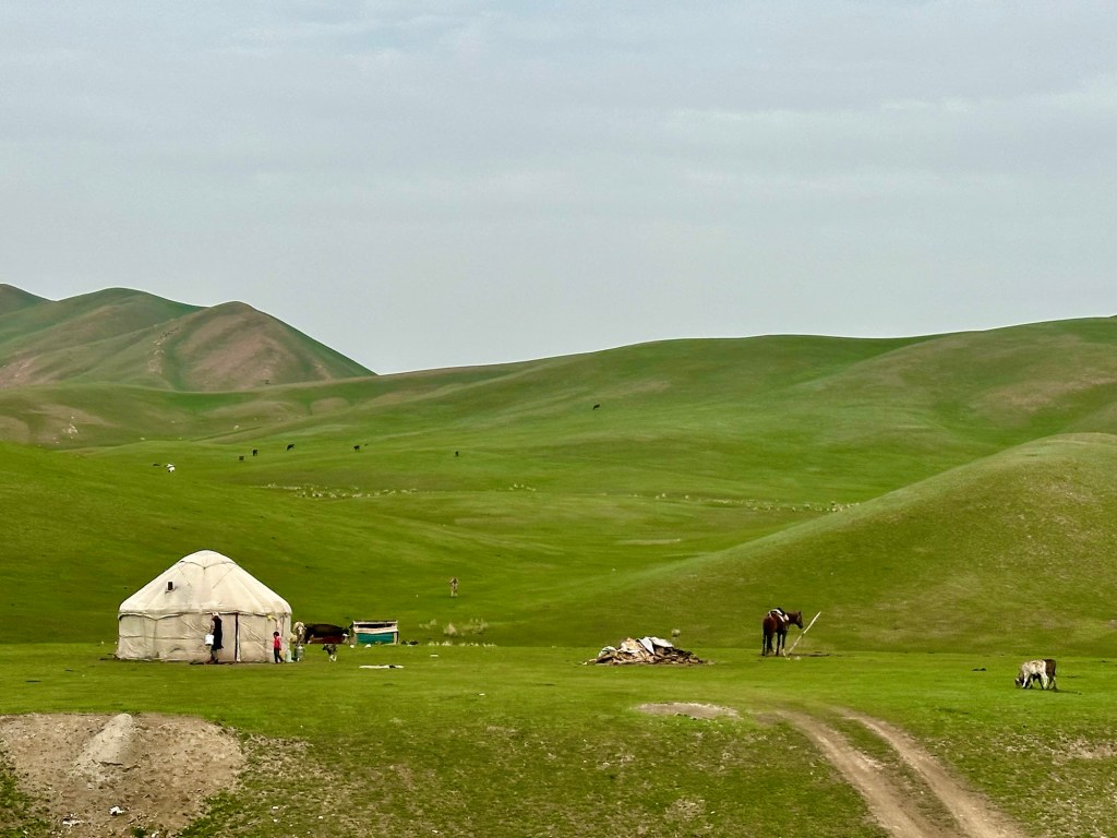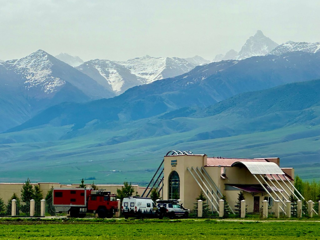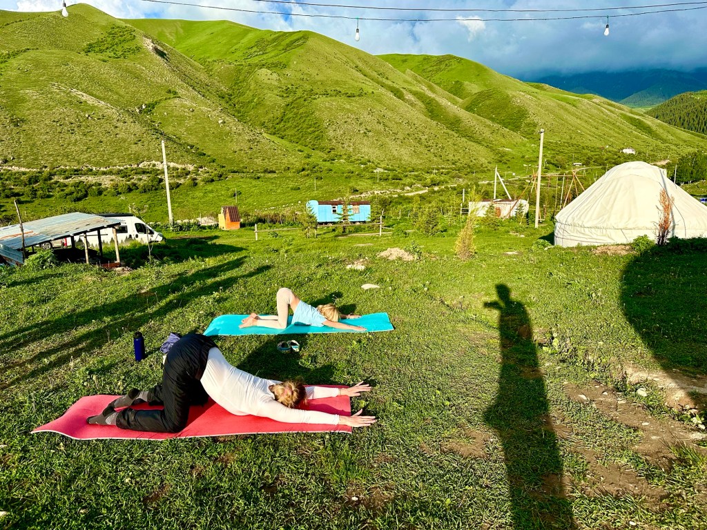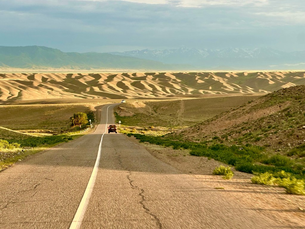 Ráno si přivstaneme. Emmu už totiž od večera „lochtá v bříšku“ neb se už nemůže dočkat dne (a my samozřejmě s ní). O pár set kilometrů dál na nás totiž čeká návštěva z Mělníka a Bruselu. Zase za námi dorazila Patra s Blankou, tentokrát doplněny i o mou sestřenici Silvu. Naši věrní čtenáři disponující funkční pamětí si jistě vybaví, že jednou už jsme se už na téhle cestě s Petrou a Blankou potkali – bylo to před neuvěřitelnými devíti měsíci v Kanadě. Je to už osvědčená receptura a my se zase těšíme na milou společnost. Děti se už tetiček také nemůžou dočkat, a proto spěcháme k jezeru Issyk-Kul, u kterého máme spicha. Holky na nás čekají v útulných jurtičkách na břehu jezera a naše shledání tak nemůže být stylovější. Jezero Issyk-kul leží v podhůří pohoří Tian Šan. Tian Šan, tedy Nebeské hory, je jedno z největších pohoří světa, doplňující onu svatou velehorskou trojici Himalájí, Karakoramu a Pamíru. Tvoří také přirozenou hranici mezi oběma zeměmi a Čínou, což se asi docela hodí.