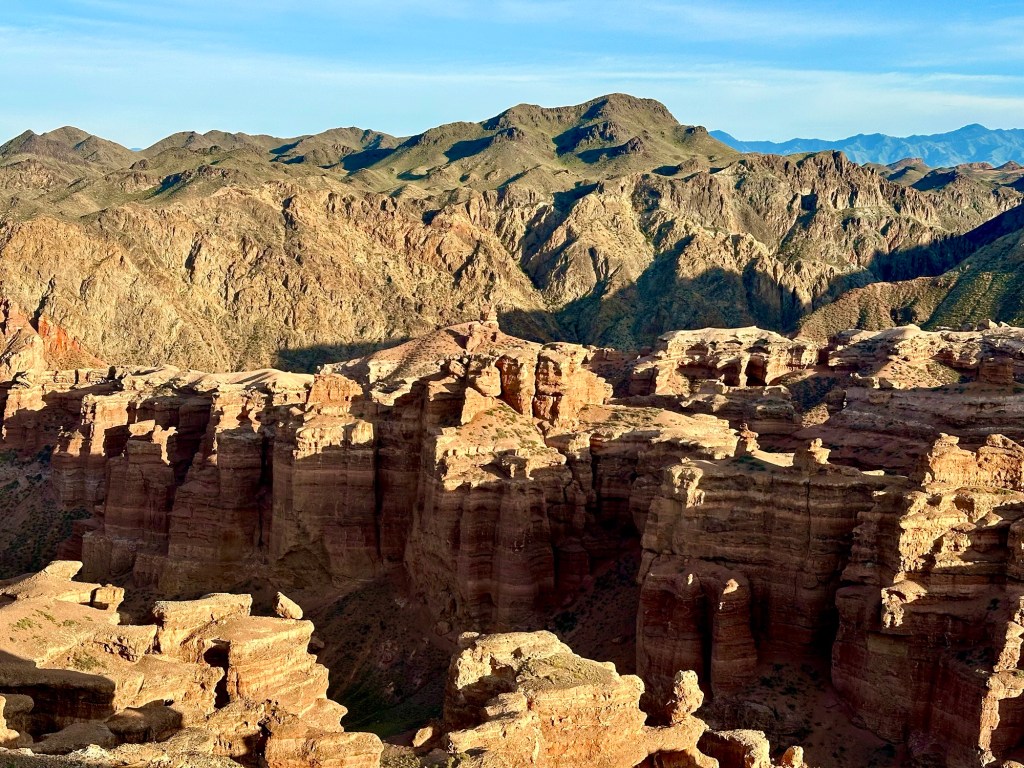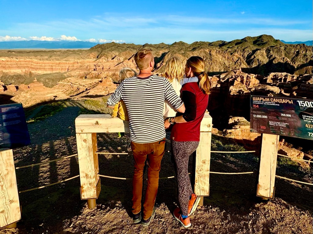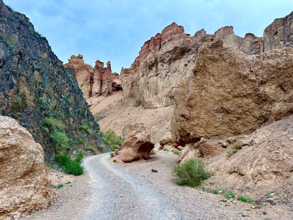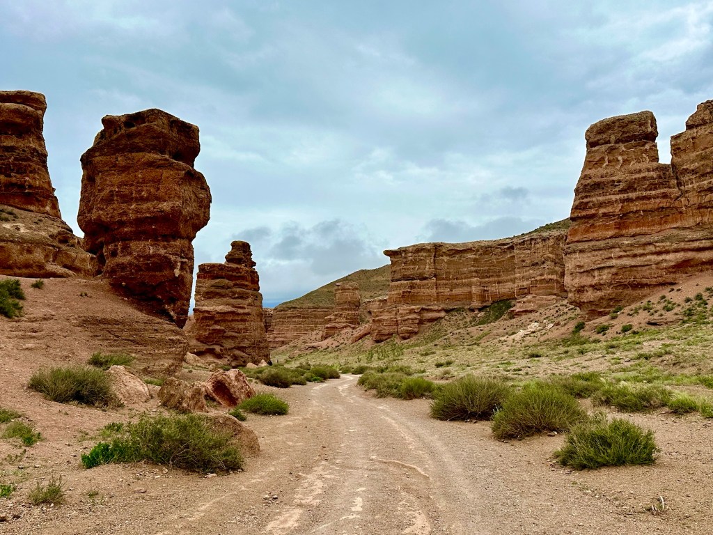Když pak usoudíme, že hor a horských luk, bystřin a jezer máme už dost, netrvá nám to ani dvě hodinky a z hor sjedeme k Čarynskému kaňonu (Charyn Canyon). Tenhle kousek Kazachstánu je vskutku rozmanitý (což se – jak se později na vlastní kůži přesvědčíme – o zbytku této déváté největší země světa moc říct nedá….). Čarynský kaňon – nebo jak opět sugestivně praví turistický průvodce „Grand Canyon Střední Asie“ je 90 kilometrů dlouhý a až 500 metrů hluboký zářez do jinak na zrakové vjemy chudé (čti naprosto prázdné a mrtvé) krajiny. Přijíždíme sem při západu slunce a ta pouštní krajina naskýtá po všech těch zelených horských údolích, překvapivě osvěžující pohled. Je to krása.