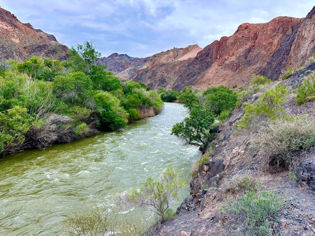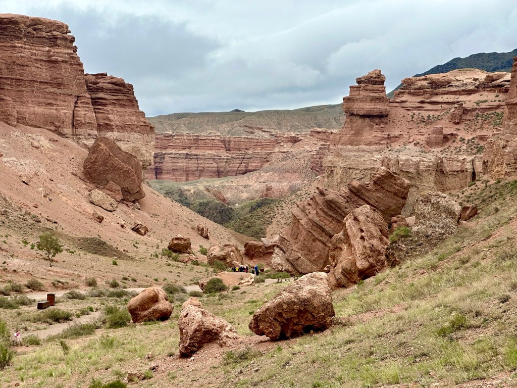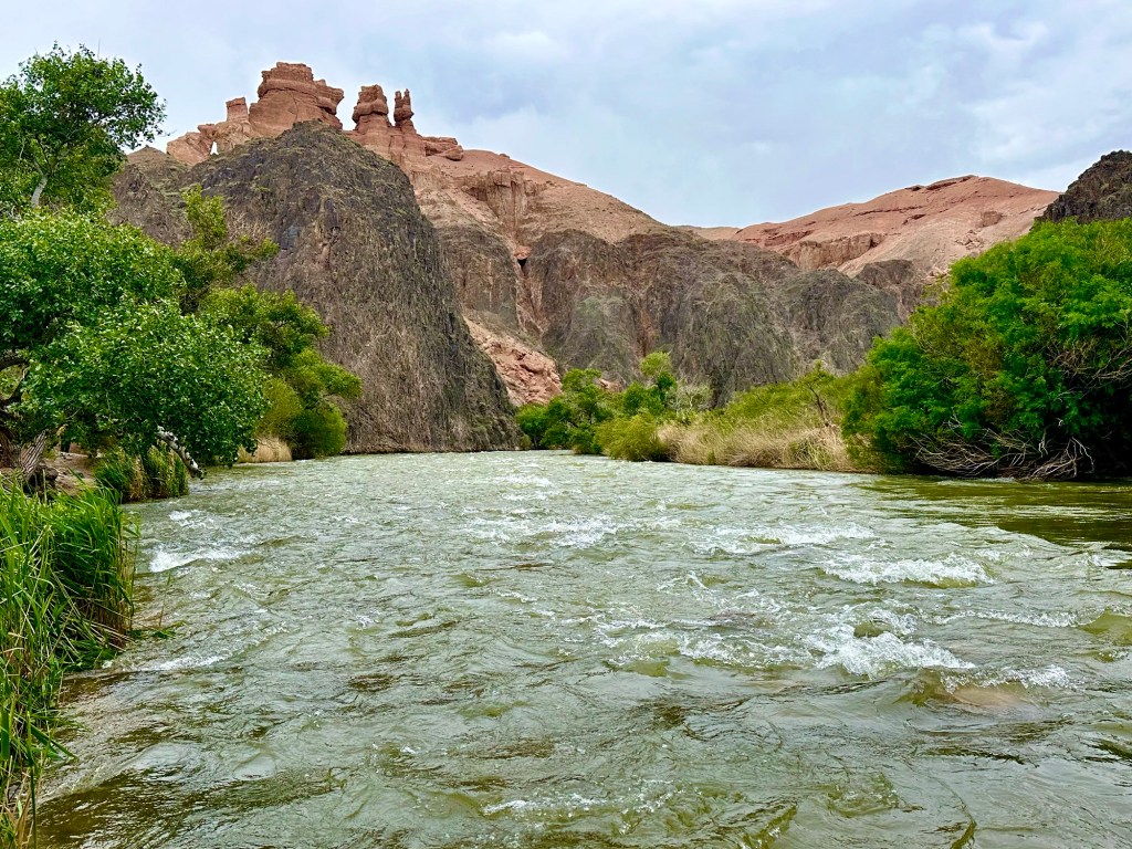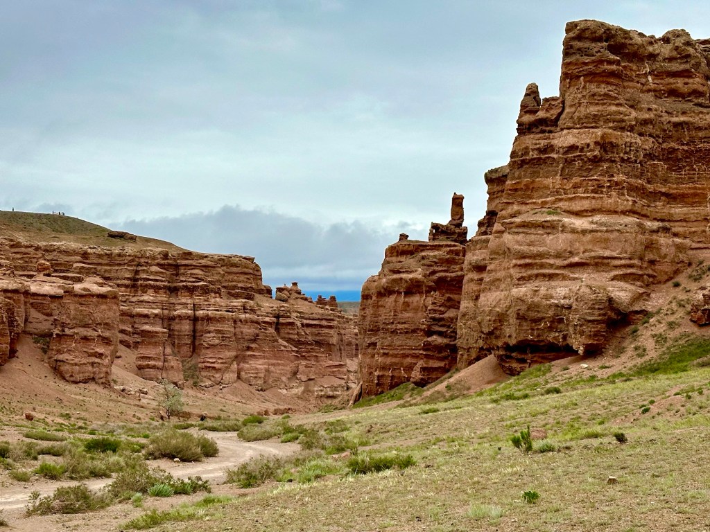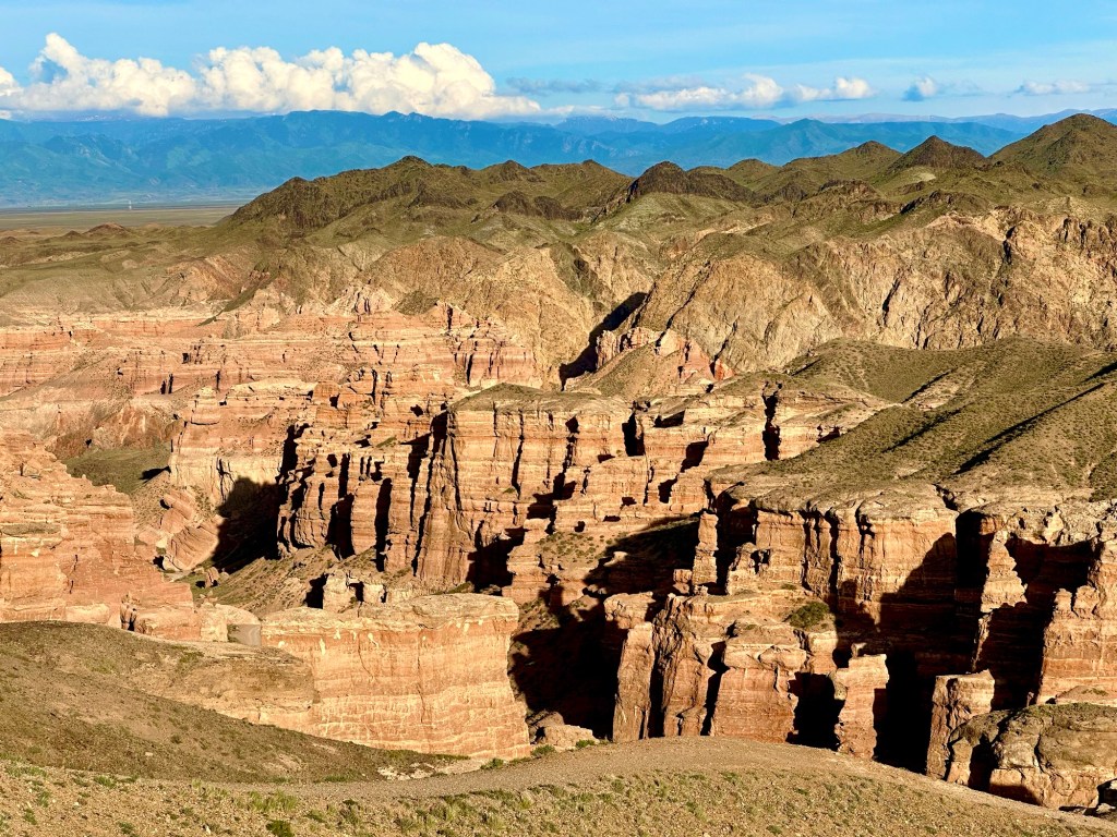 Když pak usoudíme, že hor a horských luk, bystřin a jezer máme už dost, netrvá nám to ani dvě hodinky a z hor sjedeme k Čarynskému kaňonu (Charyn Canyon). Tenhle kousek Kazachstánu je vskutku rozmanitý (což se – jak se později na vlastní kůži přesvědčíme – o zbytku této déváté největší země světa moc říct nedá….). Čarynský kaňon – nebo jak opět sugestivně praví turistický průvodce „Grand Canyon Střední Asie“ je 90 kilometrů dlouhý a až 500 metrů hluboký zářez do jinak na zrakové vjemy chudé (čti naprosto prázdné a mrtvé) krajiny. Přijíždíme sem při západu slunce a ta pouštní krajina naskýtá po všech těch zelených horských údolích, překvapivě osvěžující pohled. Je to krása.
