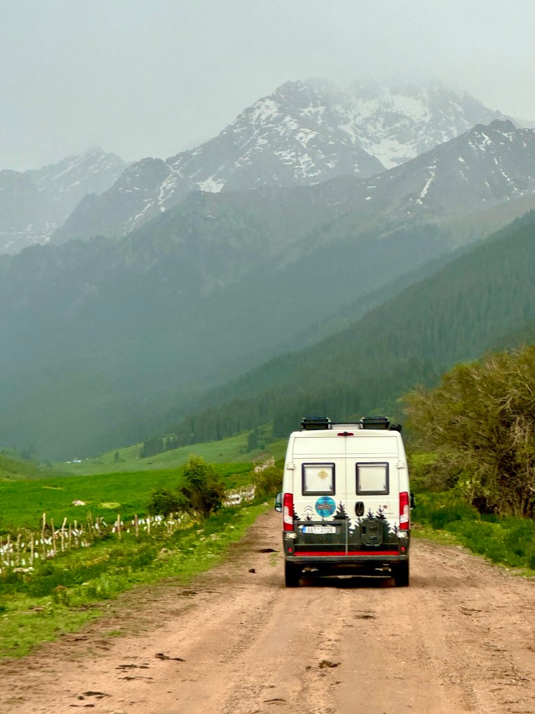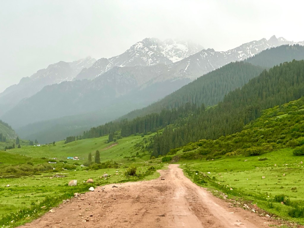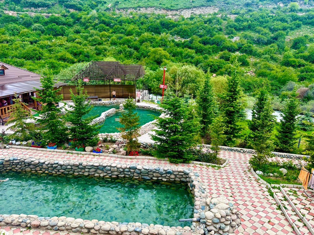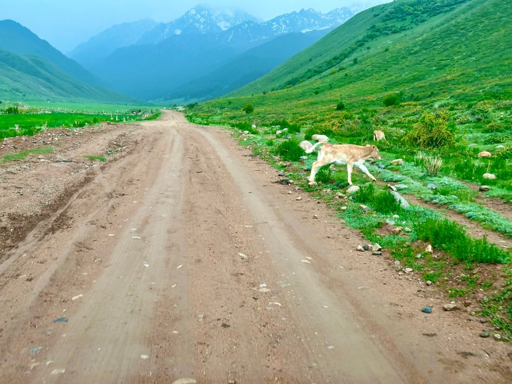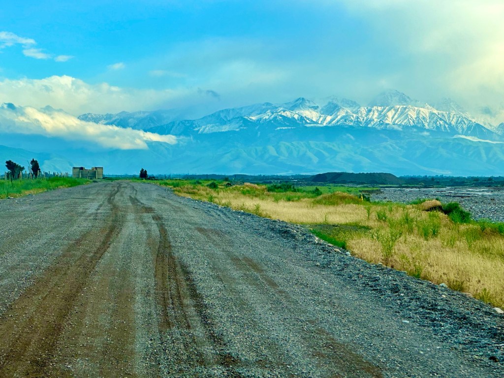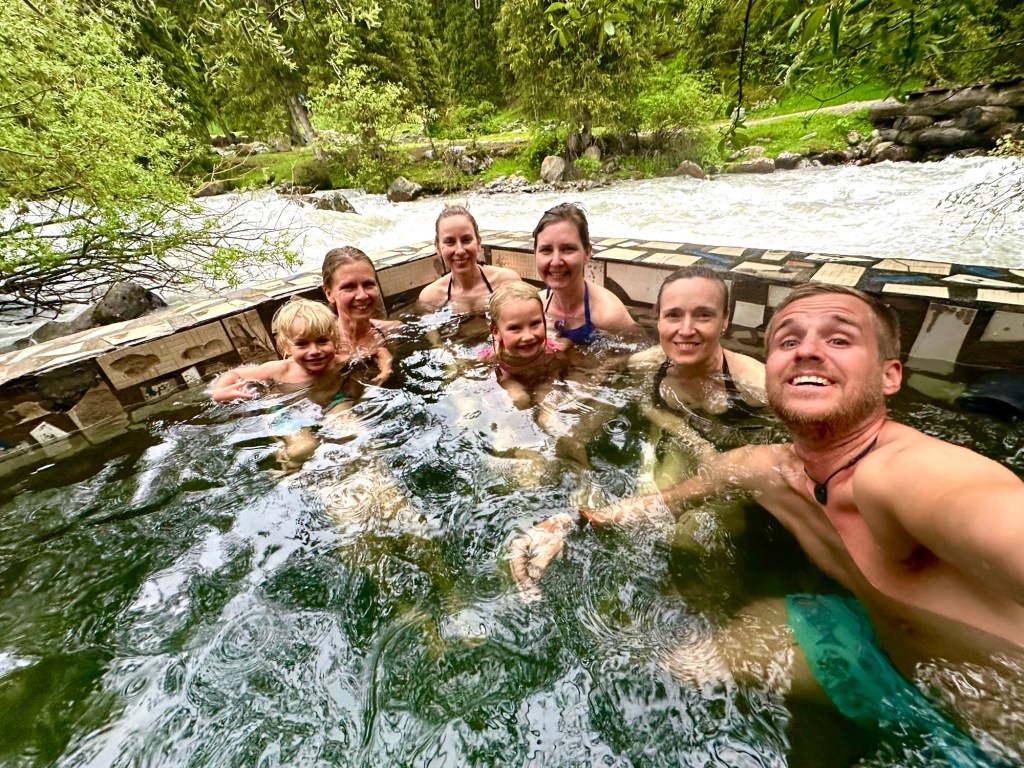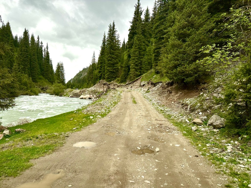 Naše první kroky vedou právě do pohoří Tian Šan. Máme vyhlídnutý pěkný výlet, který strategicky začíná u velmi horkých pramenů. Podle místních k nim také vede poměrně slušná cesta, a tudíž neváháme a hned druhý den ráno míříme právě tam. Brzy nám však dochází, že v hodnocení cest jako „slušná“, „kvalitní“ nebo „dobrá“ si s místními opravdu rozumět nebudeme. Přes patnáct kilometrů se tak drkocáme po horské pěšině, na které bych se trápil i na horském kole, musíme překonat několik brodů a na závěr si zahrajeme ruskou ruletu v podobě jednoho na půl ztrouchnivělého mostu. Ještě k tomu vydatně prší. Inu, co bychom neudělali pro horkou koupel. Krom toho prostě nebylo kde se otočit, takže nám tak nějak nic jiného nezbylo. Ještě, že nám Petra přivezla lahev slivovice. Když se konečně dostaneme na místo, zmizí v nás skoro celá. Jsme nakonec v bývalém Sovětském svazu, je potřeba dodržovat místní zvyklosti…