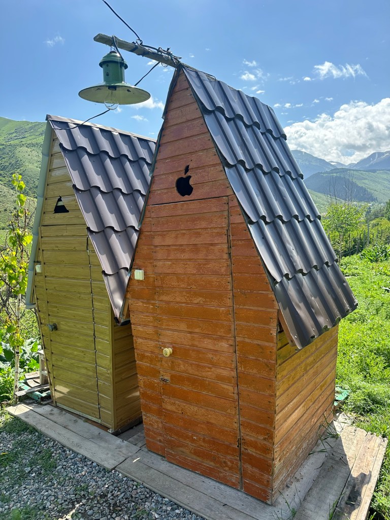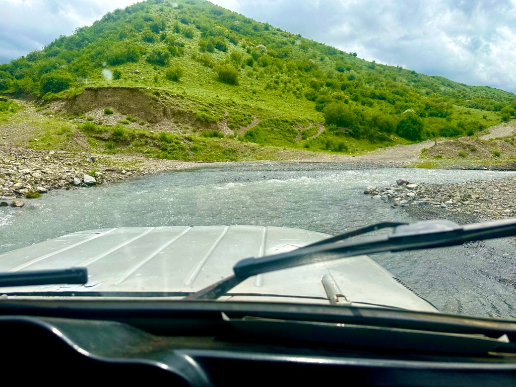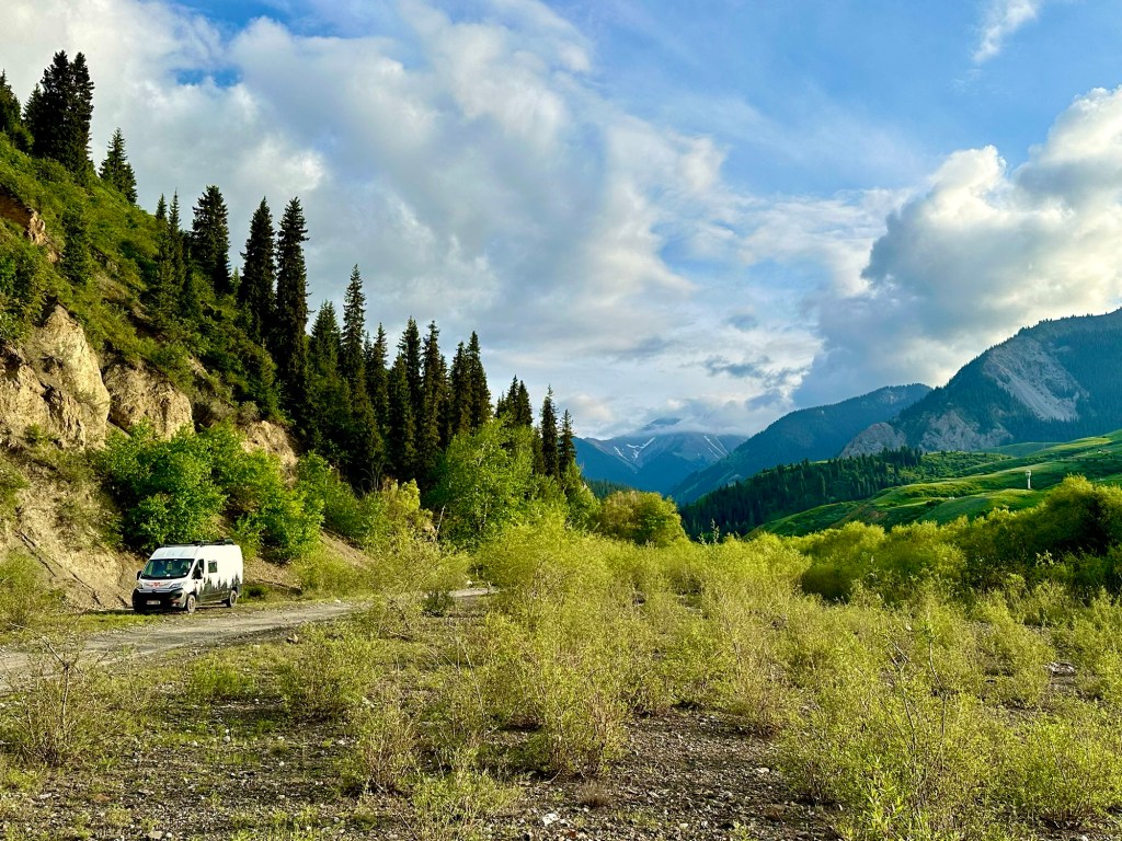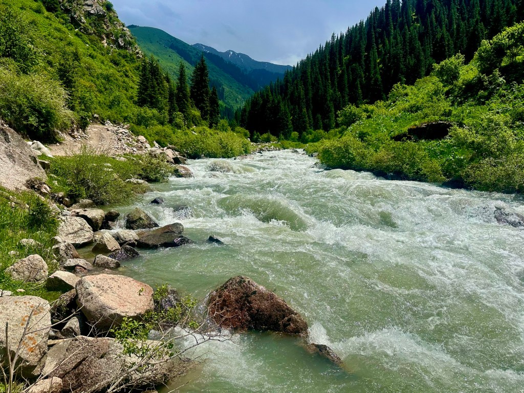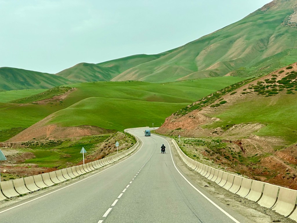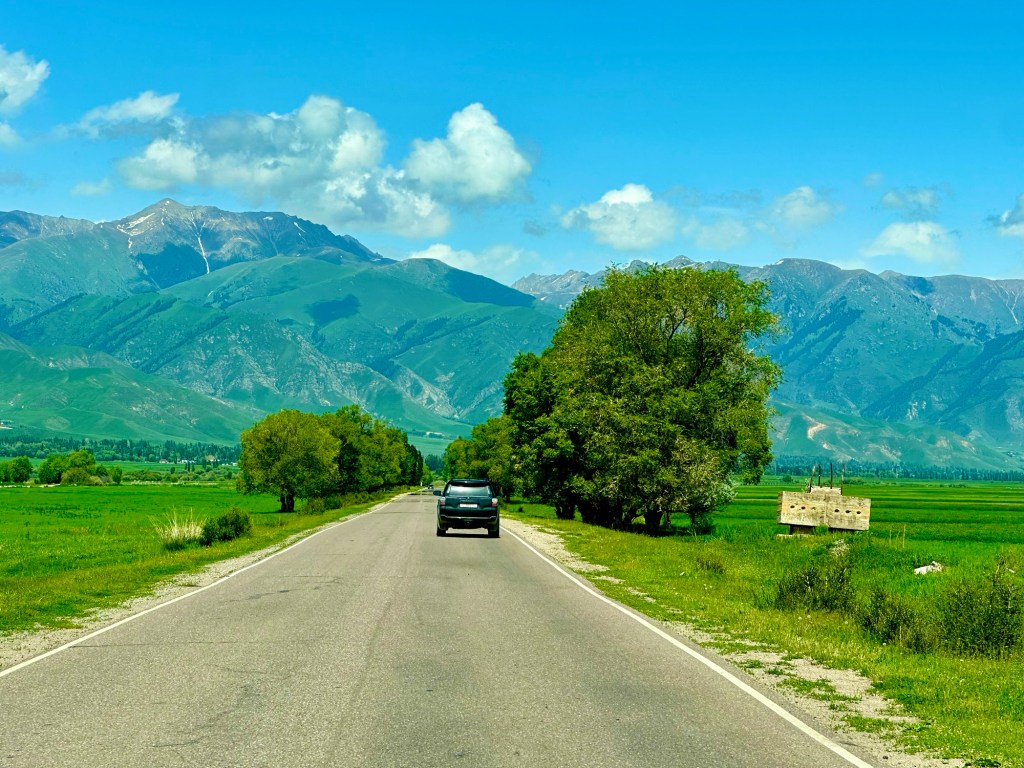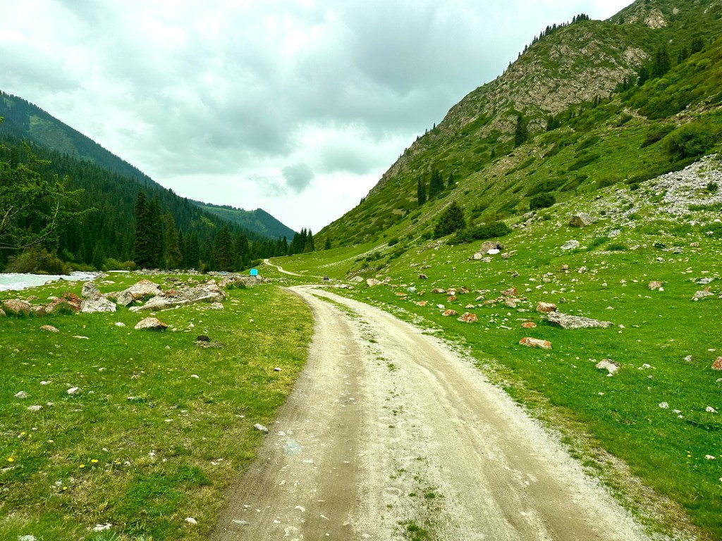 Naše první kroky vedou právě do pohoří Tian Šan. Máme vyhlídnutý pěkný výlet, který strategicky začíná u velmi horkých pramenů. Podle místních k nim také vede poměrně slušná cesta, a tudíž neváháme a hned druhý den ráno míříme právě tam. Brzy nám však dochází, že v hodnocení cest jako „slušná“, „kvalitní“ nebo „dobrá“ si s místními opravdu rozumět nebudeme. Přes patnáct kilometrů se tak drkocáme po horské pěšině, na které bych se trápil i na horském kole, musíme překonat několik brodů a na závěr si zahrajeme ruskou ruletu v podobě jednoho na půl ztrouchnivělého mostu. Ještě k tomu vydatně prší. Inu, co bychom neudělali pro horkou koupel. Krom toho prostě nebylo kde se otočit, takže nám tak nějak nic jiného nezbylo. Ještě, že nám Petra přivezla lahev slivovice. Když se konečně dostaneme na místo, zmizí v nás skoro celá. Jsme nakonec v bývalém Sovětském svazu, je potřeba dodržovat místní zvyklosti…