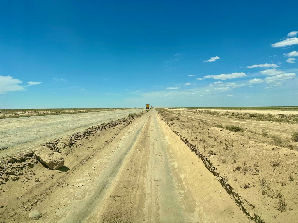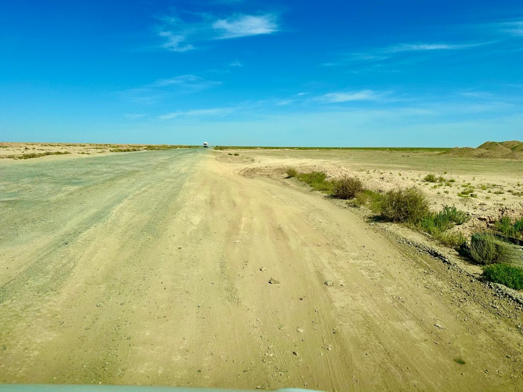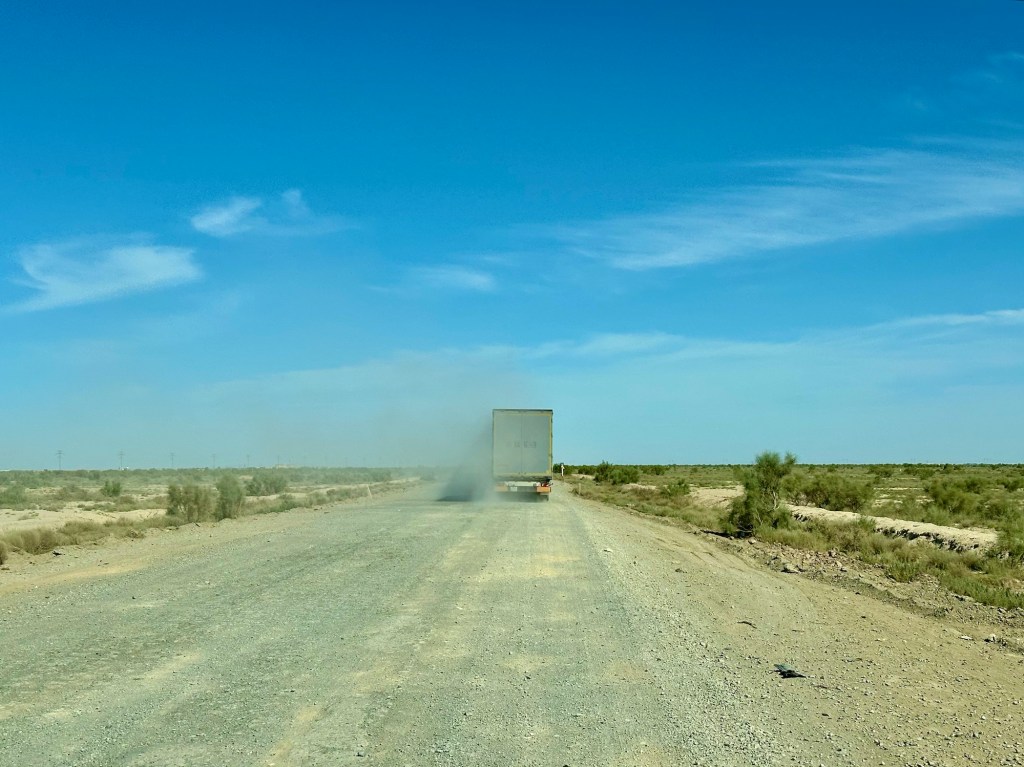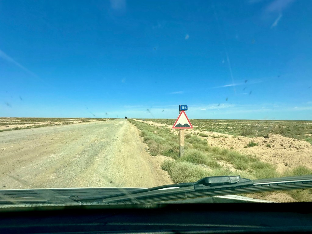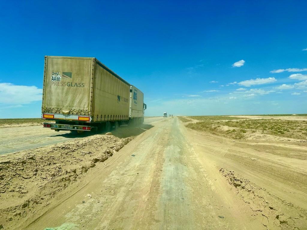 Druhý den, s východem slunce, zase vyrážíme. Slunko totiž nabere celkem rychle hodně na síle, a tak raději startujeme a žhavíme klimatizaci co nejdřív. S kvalitou silnice to jde od devíti k pěti a čím více se blížíme ke kazašské hranici, tím je silnice horší. Chvílemi raději ze silnice sjíždíme a jedeme pouští podélně s oficiální cestou. V některých úsecích jedeme zhruba 5 kilometrů za hodinu a jindy sjíždíme do hlubokých rigolů, které používají jen osobní auta a kde se jede o něco lépe, jen se tam stěží vejdeme.