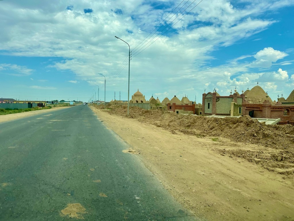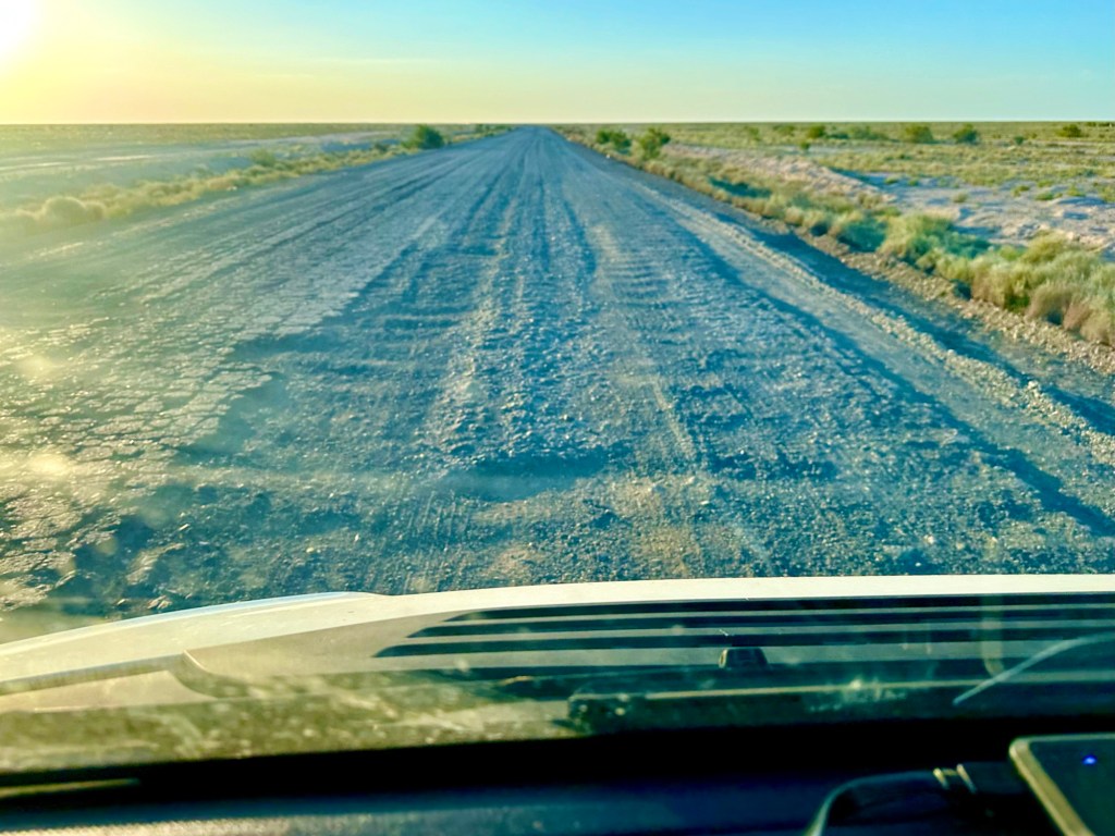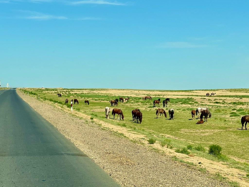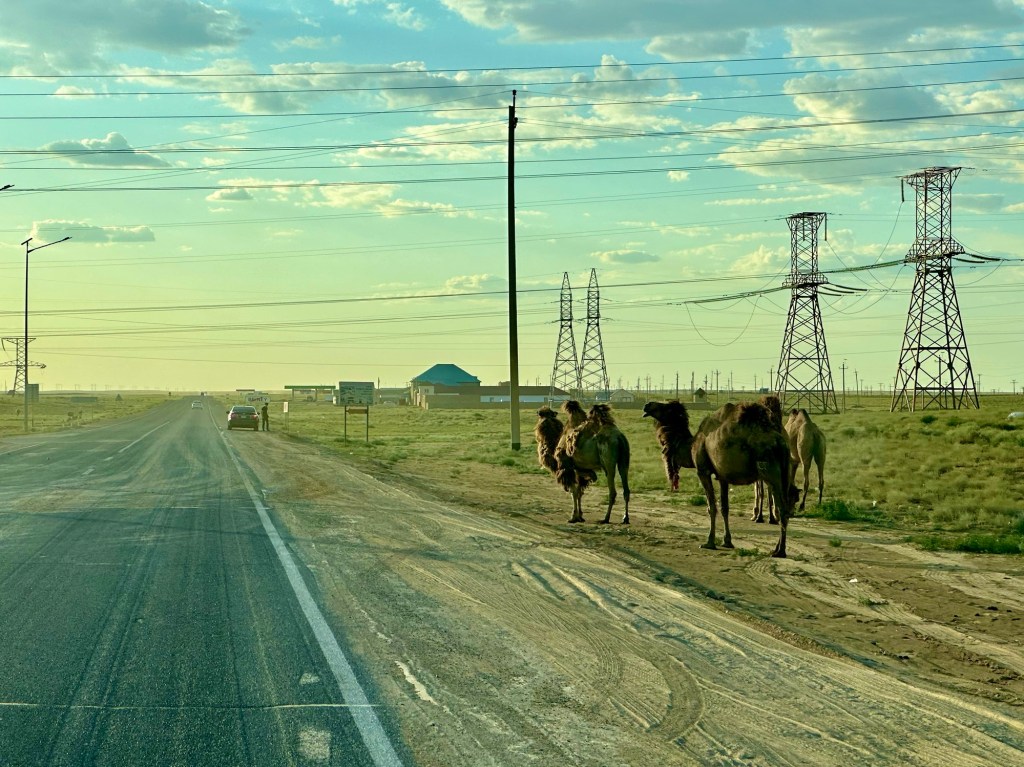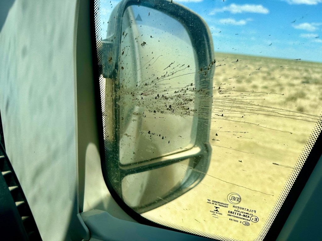 Druhý den, s východem slunce, zase vyrážíme. Slunko totiž nabere celkem rychle hodně na síle, a tak raději startujeme a žhavíme klimatizaci co nejdřív. S kvalitou silnice to jde od devíti k pěti a čím více se blížíme ke kazašské hranici, tím je silnice horší. Chvílemi raději ze silnice sjíždíme a jedeme pouští podélně s oficiální cestou. V některých úsecích jedeme zhruba 5 kilometrů za hodinu a jindy sjíždíme do hlubokých rigolů, které používají jen osobní auta a kde se jede o něco lépe, jen se tam stěží vejdeme.