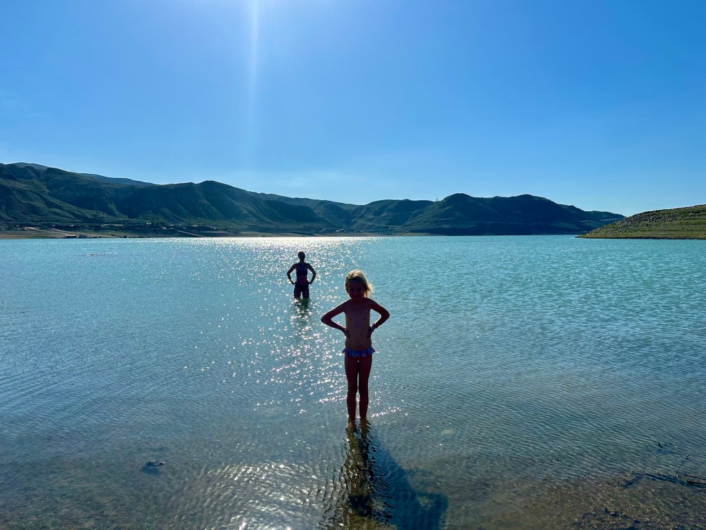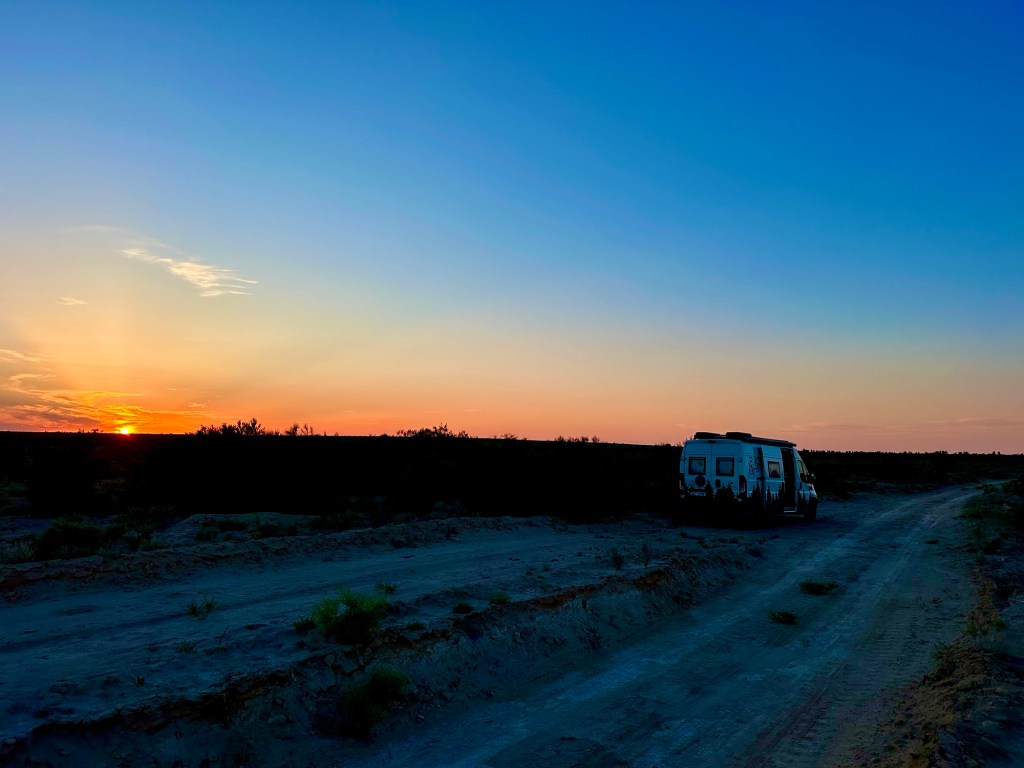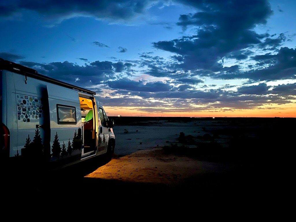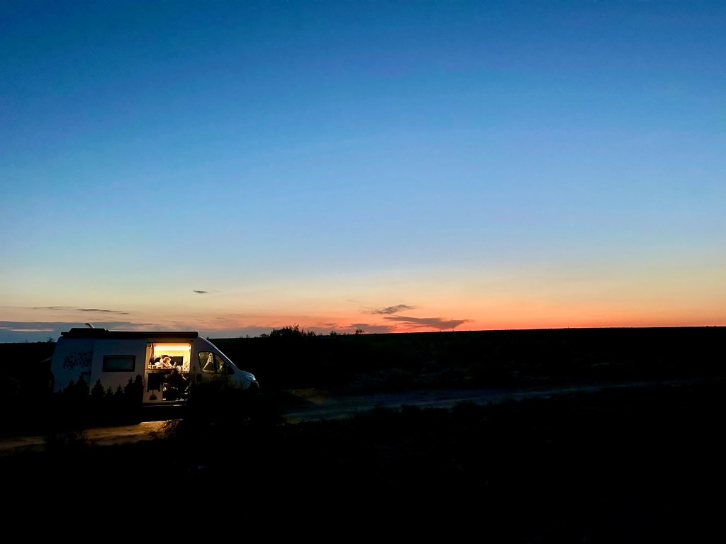 Kdo má obytnou dodávku také ví, že takové plně naložené auto se skříňkami plnými proviantu, nádobím a příbory může být zatraceně hlučné. My proto pro jistotu většinu hlučných věcí ze zásuvek vyndáváme a balíme do peřin a ručníků, mezi skleničky a příbory cpeme, přes protesty dětí, jejich obří sbírku plyšáků. Hluk v autě se nám tak podaří snížit na přijatelnou úroveň punkového koncertu s občasným přechodem do heavy metalu (to když nevyberu výmol). Krom toho je samozřejmě ukrutné vedro a zmrzlinky dojdou hned první odpoledne. A tak musíme jet až do západu slunce (a mohli se chladit klimatizací, která funguje jen za jízdy) než se rozhodneme sjet celkem náhodně ze silnice pár set metrů směrem do nekonečné do pouště a rozbít na noc tábor. K našemu překvapení jsme zvládli urazit přesně polovinu. Se západem slunce se pěkně ochladí, je už jen 33 stupňů, a my si užíváme parádní výhledy do nekonečna a naprosté ticho. Pouště jsou totiž překvapivě tiché místa.