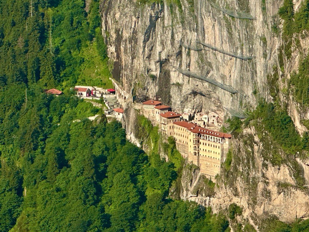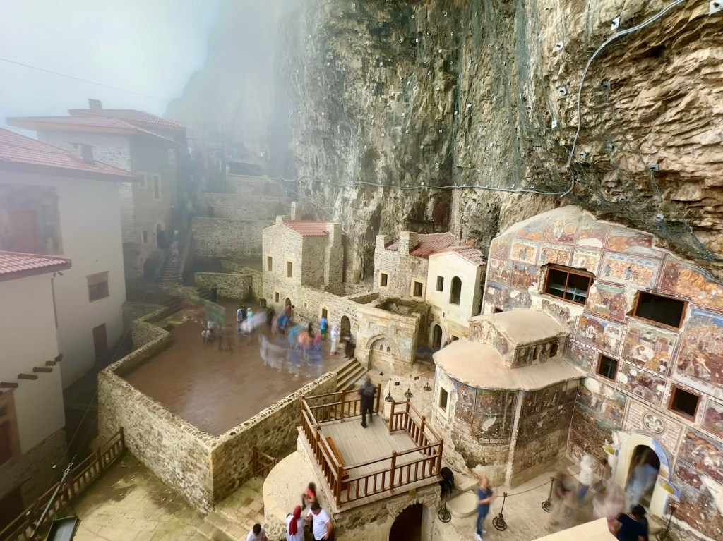 Dlouho se tu ale neochladíme. Těžko se na těch strmých kopcích parkuje natož kempuje, a tak na večer opět sjíždíme do údolí a míříme k pravoslavnému skalnímu klášteru Sumela, zázraku ranného středověkého inženýrství. Klášter totiž doslova visí uprostřed více než kilometrového útesu. Je ale neděle a zdá se, že ho s námi přijela okukovat alespoň půlka Turecka. K tomu leje jako z konve. A tak raději rychle zamíříme do lesů na opačné straně tohoto hlubokého údolí a naposledy si „užíváme“ celkem dobrodružnou off-roadovou cestu na vyhlídku, ze které by měl být klášter dobře vidět. Vzhledem k tomu, že k dešti se přidala i mlha, která by se dala krájet, máme celkem jistotu, že zde budeme sami. Ráno se ale krásně vyčasí a my místo neproniknutelné mlhy máme skutečně krásný výhled.