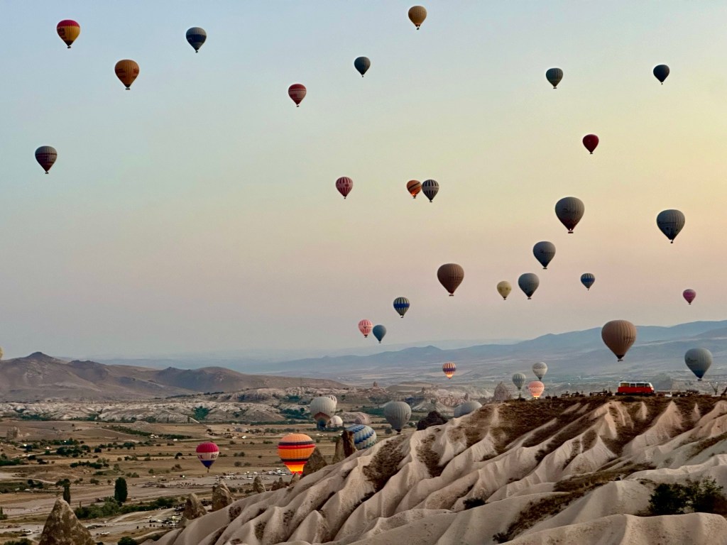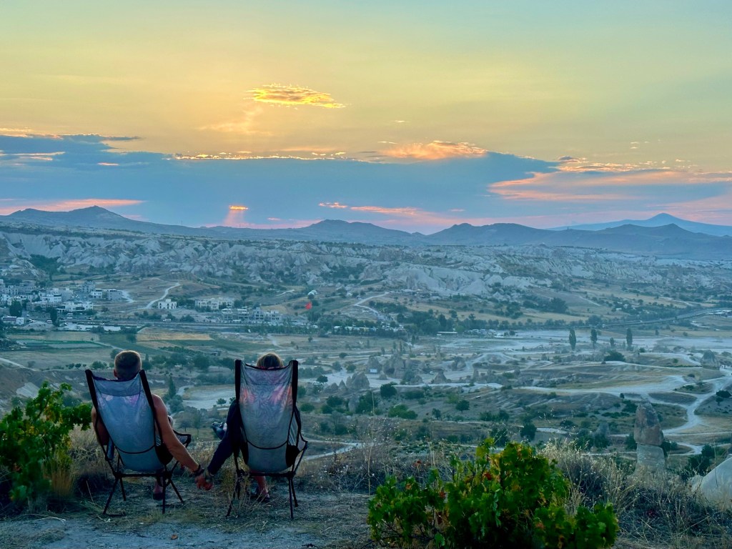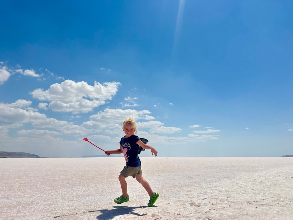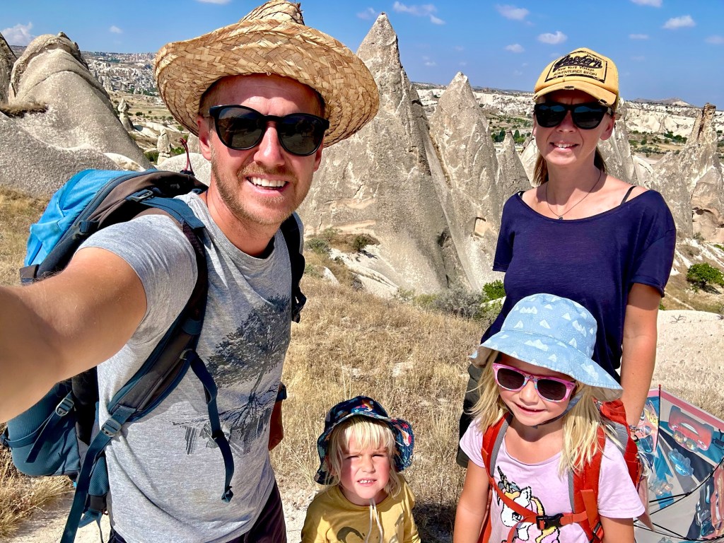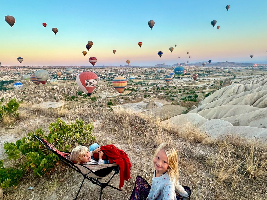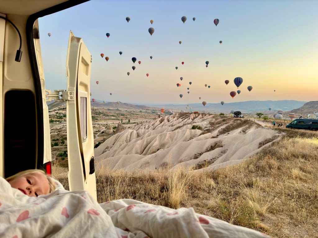 Kapadocie je také známá tím, že se zde skoro každé ráno vznese více než stovka horkovzdušných balónu s turisty, a tak se rozhodneme Emmě uspořádat pořádnou balónkovou párty. Znamená to sice, že musíme vstávat hodně časně, ale vyplatí se to. Je to náramná podívaná a tím pádem i skvělá oslava. Odpoledne narazíme na kemp, kde je bazén, do kterého nás za malou úplatu pustí. Děti jsou blahem bez sebe. Večer pak po dlouhé době potkáváme cestující rodinku, a dokonce z Čech. A ještě k tomu s podobně malými dětmi (blázni). Strávíme tak dva příjemné večery v dobré společnosti a děti mají radost, že si mají s kým hrát. Po cestě jsme totiž rodin s dětmi nepotkali moc a těch s menšími dětmi ještě o dost méně. Nejzastoupenější demografickou skupinou jsou bezesporu (především němečtí) důchodci a pak mladé (instagramové) páry. Jsou-li dobrodružnější povahy přiberou na cestu třeba psa nebo kočku, ale tam to končí. S dětmi, zdá se, se lidé do takového dobrodružství spíše nepouštějí. A tak jsou pro nás i pro děti taková náhodná setkání vždy velkou událostí a povzbuzením (můžeme si totiž navzájem pěkně postěžovat).