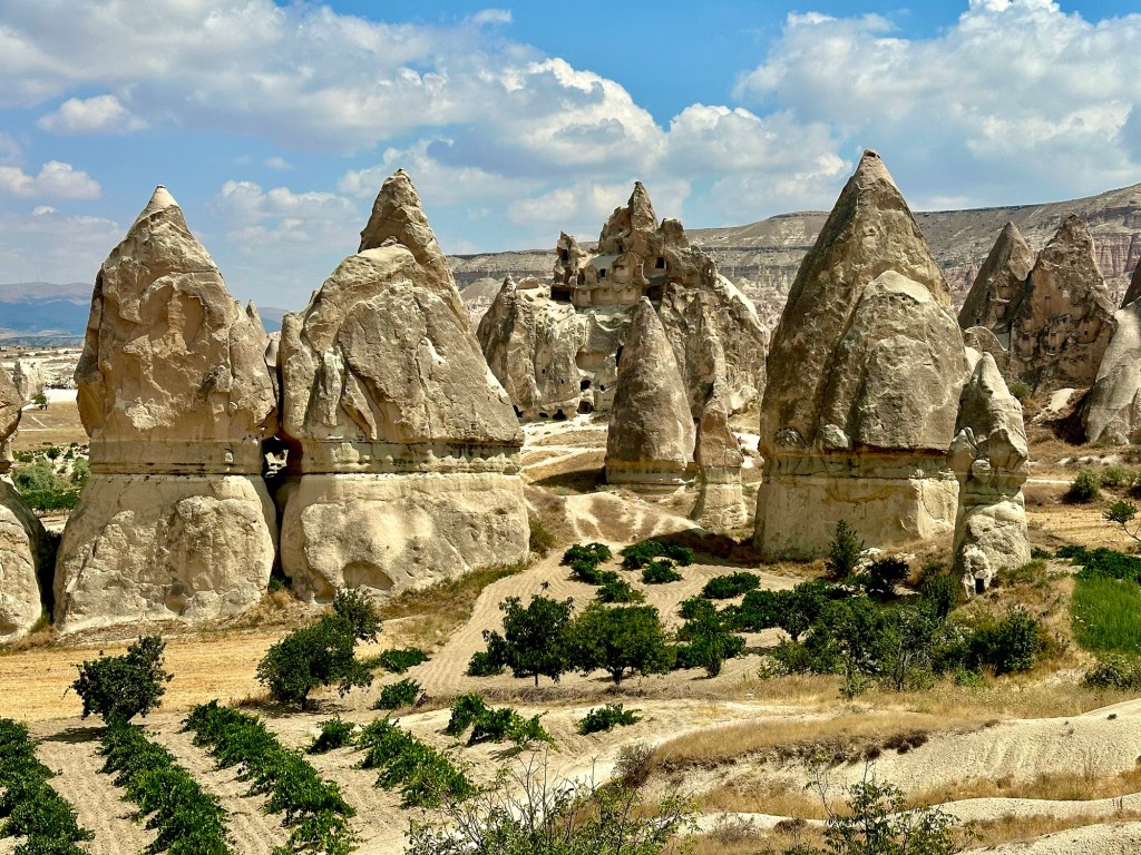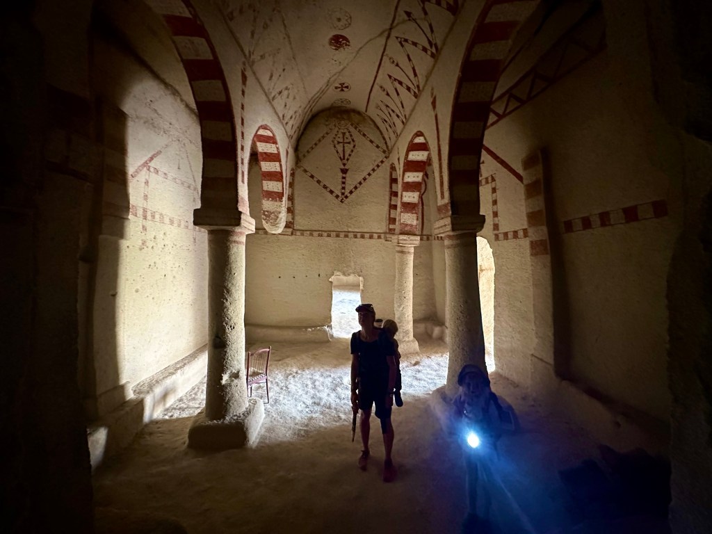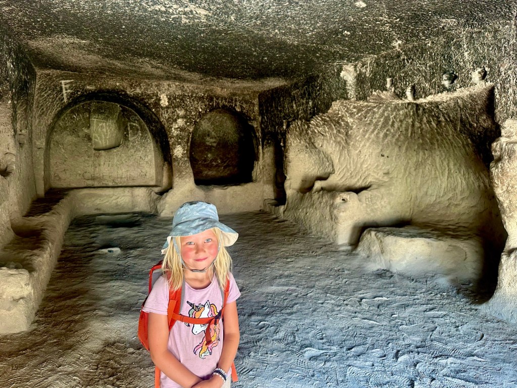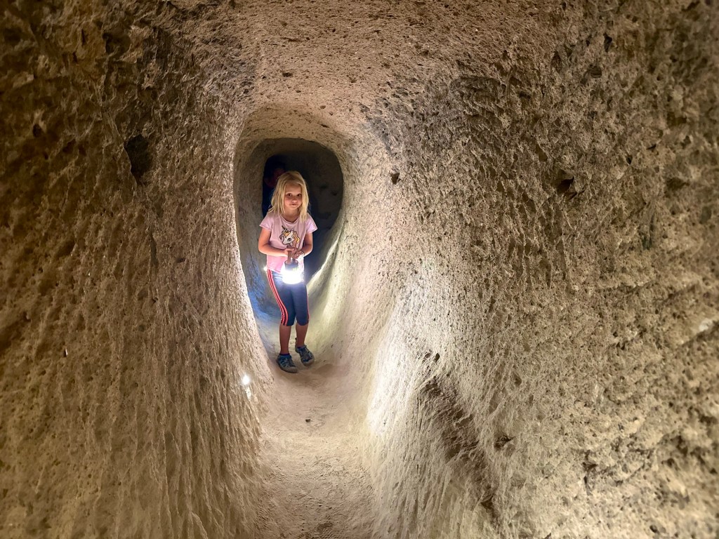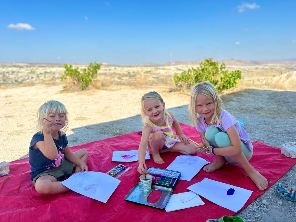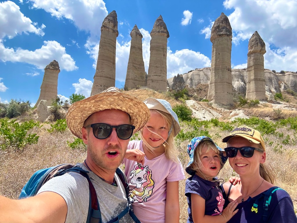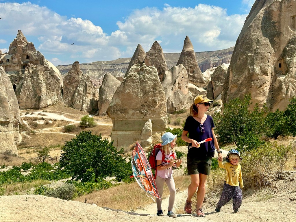 Kapadocie nás naprosto okouzlí. Labyrint roklí a obskurních skalních věží, obří podzemní skalní města a kostely, překvapivě málo turistů, parádní místo na divoké kempování a náhodné setkání s jinou cestující českou rodinkou přispěje k tomu, že si ty tři dny v Kapadocii náramně užijeme a na chvíli zapomínáme, že už vlastně míříme domů. Podnikáme několik výletů do roklí, oškubáváme zde hojně se vyskytující meruňky a hroznové víno, prolézáme bezpočet volně přístupných skalních příbytků a krom toho se připravujeme na velkou oslavu Emminých narozenin. Bude jí 7! Jako jediná z nás oslaví na cestě hned dvoje narozeniny. Před rokem jsme je slavili v Yellowstonském národním parku. Občas nám přijde, že to muselo být tak před čtvrt stoletím.